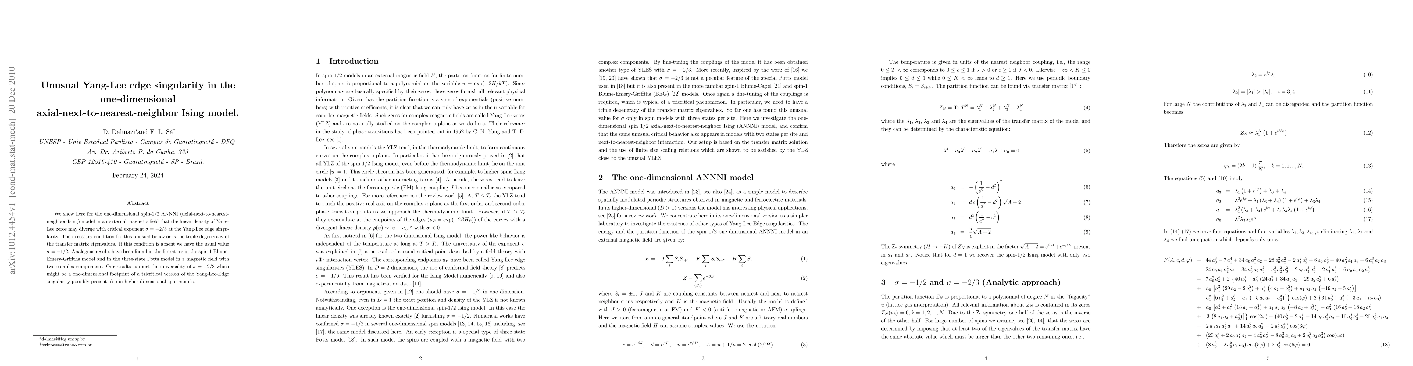 We show here for the one-dimensional spin-1/2 ANNNI (axial-next-to-nearest-neighbor-Ising) model in an external magnetic field that the linear density of Yang-Lee zeros may diverge with critical exponent $\sigma = -2/3$ at the Yang-Lee edge singularity. The necessary condition for this unusual behavior is the triple degeneracy of the transfer matrix eigenvalues. If this condition is absent we have the usual value $\sigma = -1/2$. Analogous results have been found in the literature in the spin-1 Blume-Emery-Griffths model and in the three-state Potts model in a magnetic field with two complex components. Our results support the universality of $\sigma = -2/3$ which might be a one-dimensional footprint of a tricritical version of the Yang-Lee-Edge singularity possibly present also in higher-dimensional spin models.