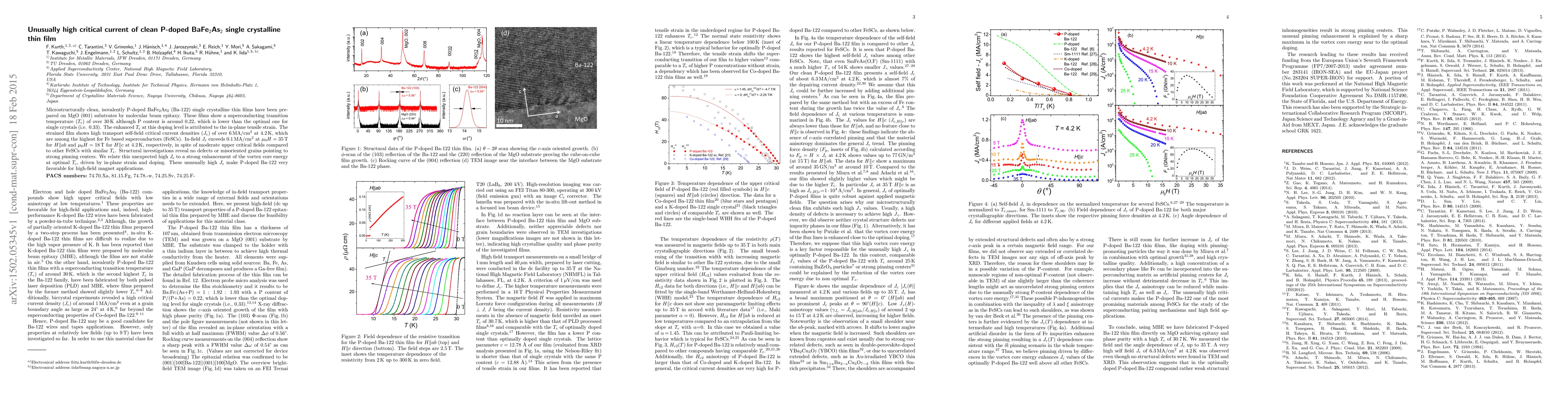 Researchers discovered unusually high critical current densities in P-doped BaFe2As2 thin films, exceeding 6 MA/cm^2 at 4.2 K, due to in-plane tensile strain and strong pinning centers.