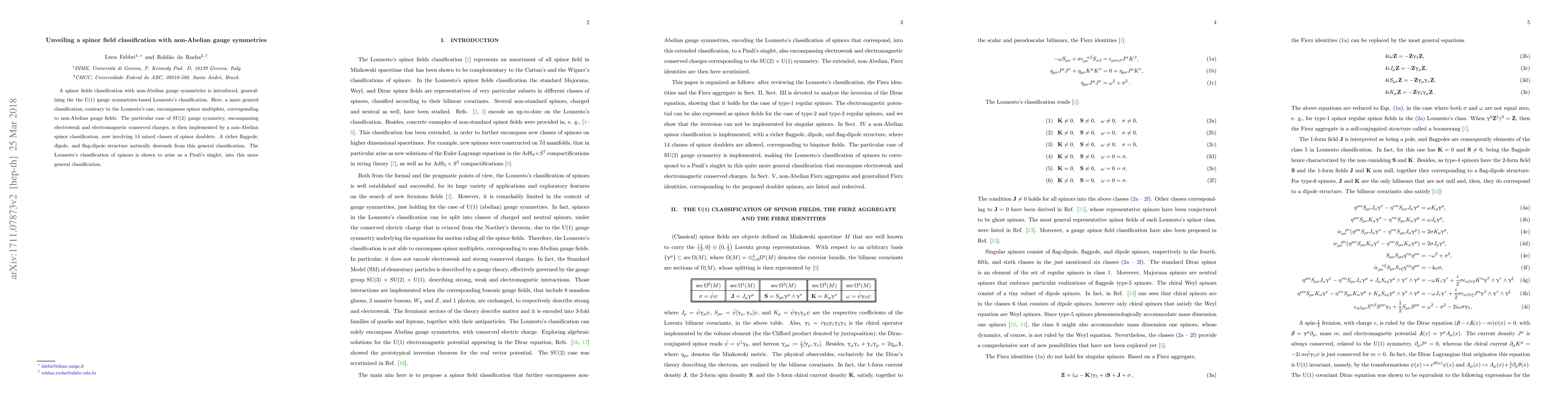 This paper introduces a new spinor fields classification based on non-Abelian gauge symmetries, generalizing Lounesto's U(1) gauge symmetry-based classification. It presents a richer classification involving 14 mixed classes for SU(2) gauge symmetry, encompassing electroweak and electromagnetic charges, and reveals a more complex flagpole, dipole, and flag-dipole structure.