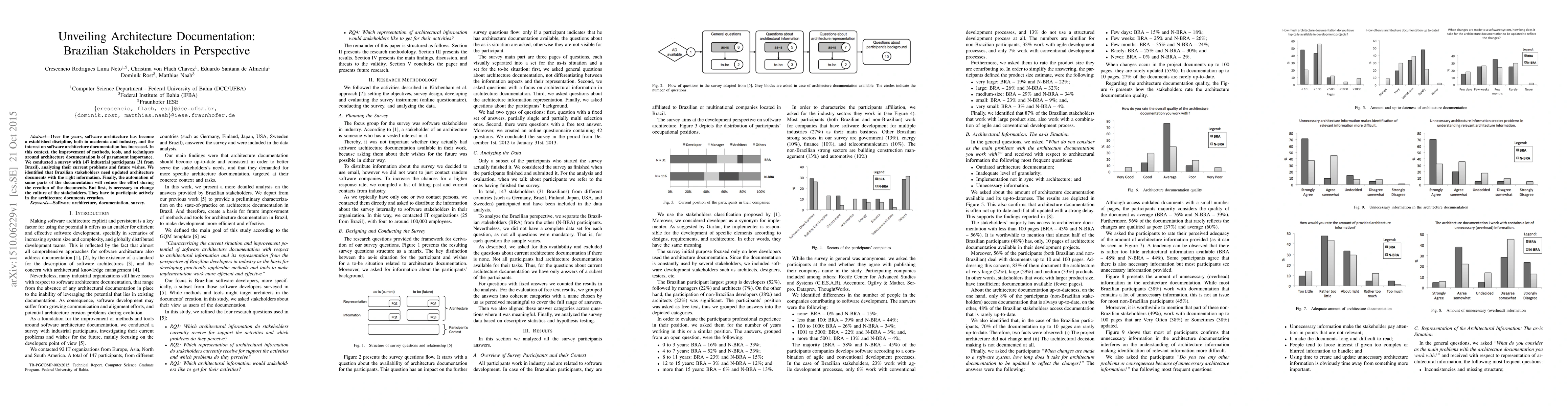 This study surveys 147 industrial participants, including 31 from Brazil, to identify issues with current architecture documentation. Brazilian stakeholders desire more relevant and updated documents, and automation of documentation processes could reduce effort, but cultural change is needed to actively involve stakeholders in the creation process.