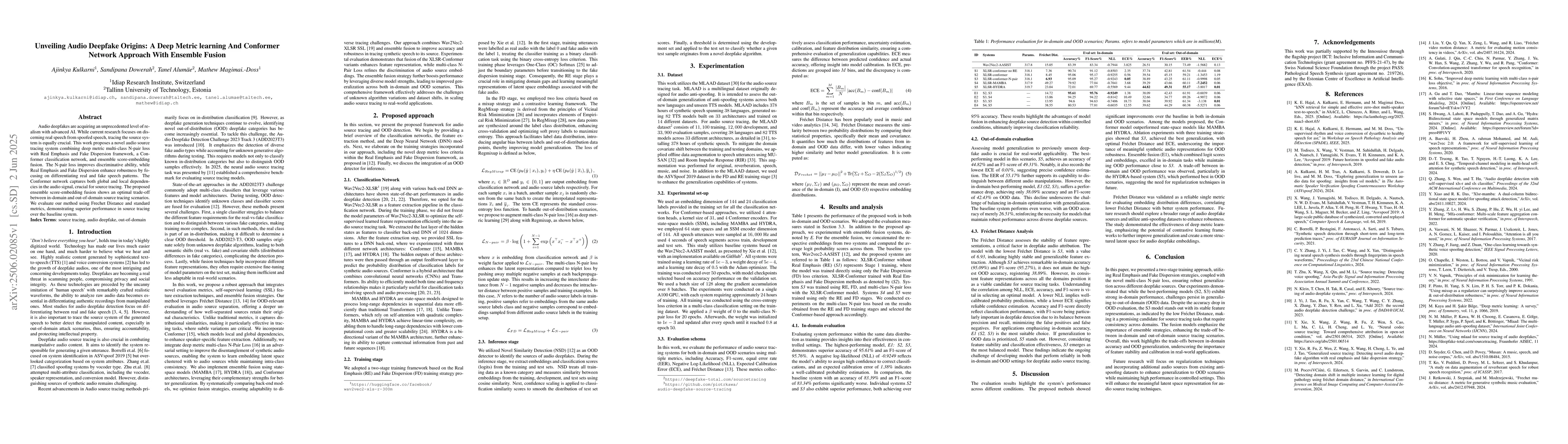 This work stands out by integrating deep metric learning, Conformer networks, and ensemble fusion specifically for audio deepfake source tracing, offering improved discrimination and robustness compared to existing methods.