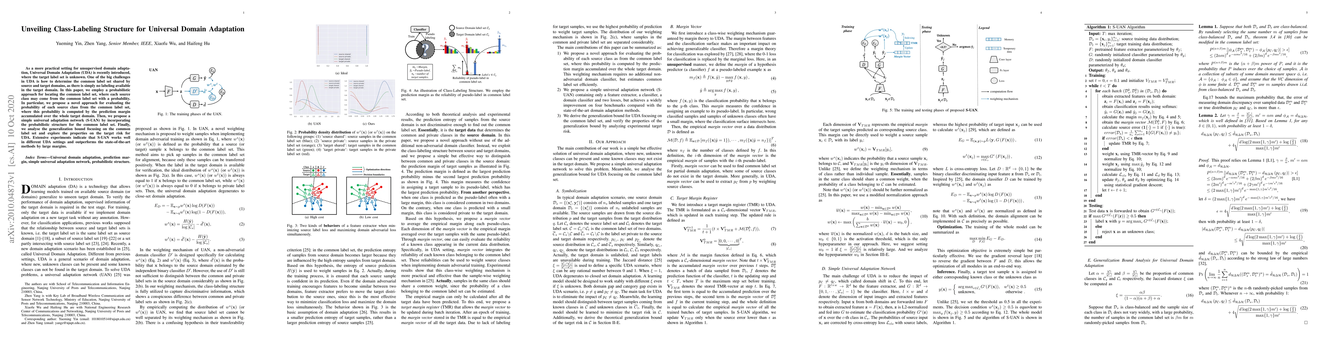 As a more practical setting for unsupervised domain adaptation, Universal Domain Adaptation (UDA) is recently introduced, where the target label set is unknown. One of the big challenges in UDA is how to determine the common label set shared by source and target domains, as there is simply no labeling available in the target domain. In this paper, we employ a probabilistic approach for locating the common label set, where each source class may come from the common label set with a probability. In particular, we propose a novel approach for evaluating the probability of each source class from the common label set, where this probability is computed by the prediction margin accumulated over the whole target domain. Then, we propose a simple universal adaptation network (S-UAN) by incorporating the probabilistic structure for the common label set. Finally, we analyse the generalization bound focusing on the common label set and explore the properties on the target risk for UDA. Extensive experiments indicate that S-UAN works well in different UDA settings and outperforms the state-of-the-art methods by large margins.
