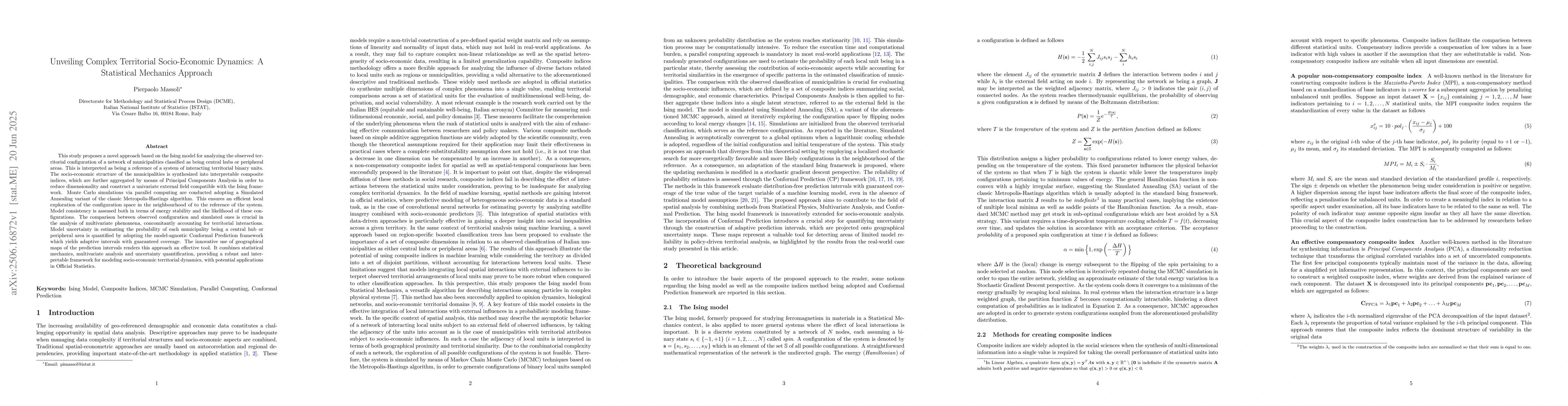 This study proposes a novel approach based on the Ising model for analyzing the observed territorial configuration of a network of municipalities classified as being central hubs or peripheral areas. This is interpreted as being a reference of a system of interacting territorial binary units. The socio-economic structure of the municipalities is synthesized into interpretable composite indices, which are further aggregated by means of Principal Components Analysis in order to reduce dimensionality and construct a univariate external field compatible with the Ising framework. Monte Carlo simulations via parallel computing are conducted adopting a Simulated Annealing variant of the classic Metropolis-Hastings algorithm. This ensures an efficient local exploration of the configuration space in the neighbourhood of to the reference of the system. Model consistency is assessed both in terms of energy stability and the likelihood of these configurations. The comparison between observed configuration and simulated ones is crucial in the analysis of multivariate phenomena, concomitantly accounting for territorial interactions. Model uncertainty in estimating the probability of each municipality being a central hub or peripheral area is quantified by adopting the model-agnostic Conformal Prediction framework which yields adaptive intervals with guaranteed coverage. The innovative use of geographical maps of the prediction intervals renders this approach an effective tool. It combines statistical mechanics, multivariate analysis and uncertainty quantification, providing a robust and interpretable framework for modeling socio-economic territorial dynamics, with potential applications in Official Statistics.