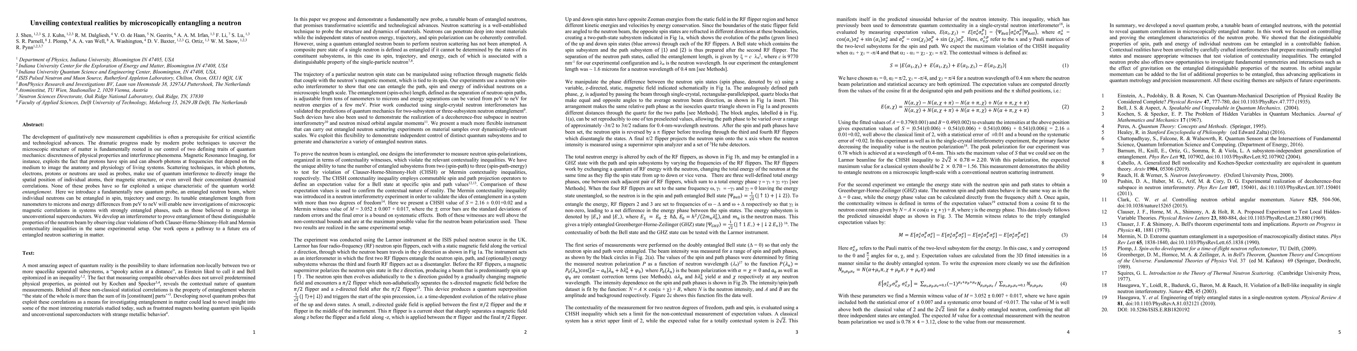 The development of qualitatively new measurement capabilities is often a prerequisite for critical scientific and technological advances. The dramatic progress made by modern probe techniques to uncover the microscopic structure of matter is fundamentally rooted in our control of two defining traits of quantum mechanics: discreteness of physical properties and interference phenomena. Magnetic Resonance Imaging, for instance, exploits the fact that protons have spin and can absorb photons at frequencies that depend on the medium to image the anatomy and physiology of living systems. Scattering techniques, in which photons, electrons, protons or neutrons are used as probes, make use of quantum interference to directly image the spatial position of individual atoms, their magnetic structure, or even unveil their concomitant dynamical correlations. None of these probes have so far exploited a unique characteristic of the quantum world: entanglement. Here we introduce a fundamentally new quantum probe, an entangled neutron beam, where individual neutrons can be entangled in spin, trajectory and energy. Its tunable entanglement length from nanometers to microns and energy differences from peV to neV will enable new investigations of microscopic magnetic correlations in systems with strongly entangled phases, such as those believed to emerge in unconventional superconductors. We develop an interferometer to prove entanglement of these distinguishable properties of the neutron beam by observing clear violations of both Clauser-Horne-Shimony-Holt and Mermin contextuality inequalities in the same experimental setup. Our work opens a pathway to a future era of entangled neutron scattering in matter.