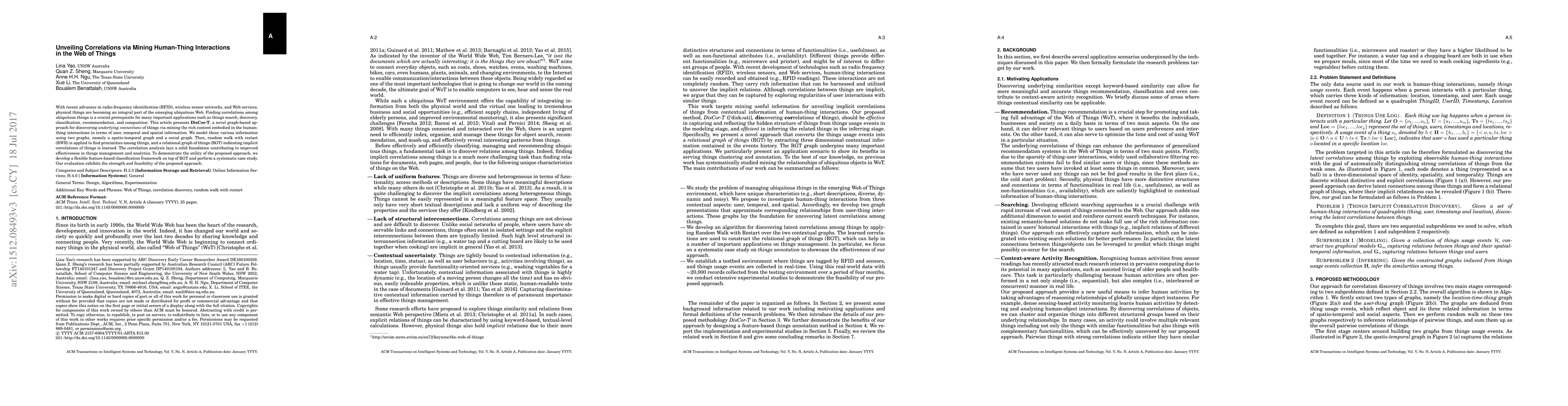 With recent advances in radio-frequency identification (RFID), wireless sensor networks, and Web services, physical things are becoming an integral part of the emerging ubiquitous Web. Finding correlations of ubiquitous things is a crucial prerequisite for many important applications such as things search, discovery, classification, recommendation, and composition. This article presents DisCor-T, a novel graph-based method for discovering underlying connections of things via mining the rich content embodied in human-thing interactions in terms of user, temporal and spatial information. We model these various information using two graphs, namely spatio-temporal graph and social graph. Then, random walk with restart (RWR) is applied to find proximities among things, and a relational graph of things (RGT) indicating implicit correlations of things is learned. The correlation analysis lays a solid foundation contributing to improved effectiveness in things management. To demonstrate the utility, we develop a flexible feature-based classification framework on top of RGT and perform a systematic case study. Our evaluation exhibits the strength and feasibility of the proposed approach.