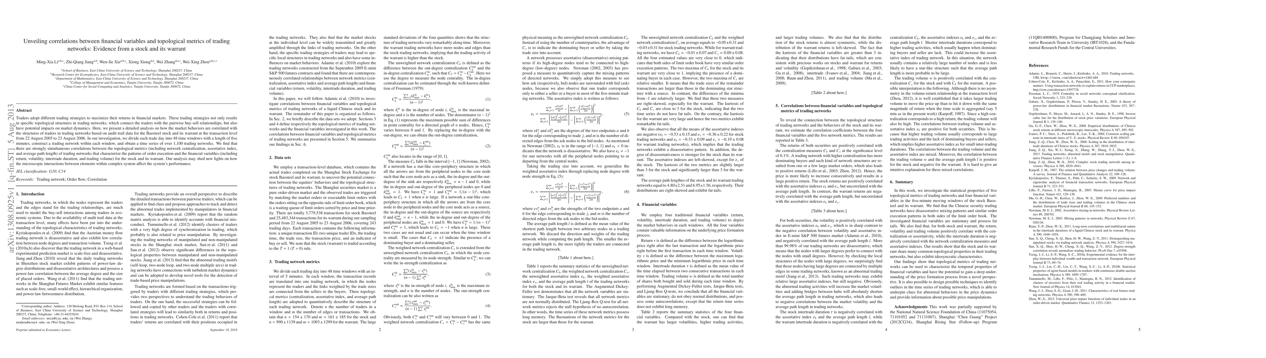 This paper investigates correlations between financial variables and topological metrics of trading networks, using Baosteel stock and its warrant data from 2005-2006. It finds strong simultaneous correlations between network structures and financial metrics, suggesting microscopic interactions impact system performance.