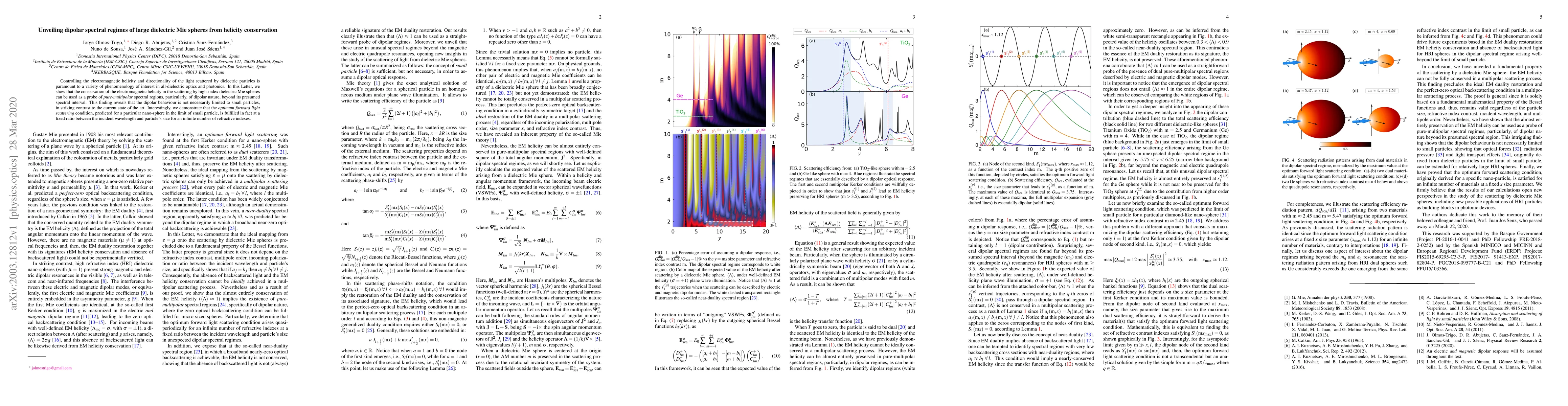 This paper demonstrates that electromagnetic helicity conservation in scattering by high-index dielectric Mie spheres can reveal dipolar spectral regimes beyond typical limits, challenging the notion that dipolar behavior is restricted to small particles. It also shows that optimal forward light scattering conditions, previously predicted for small particles, occur at a fixed size parameter across various refractive indices.