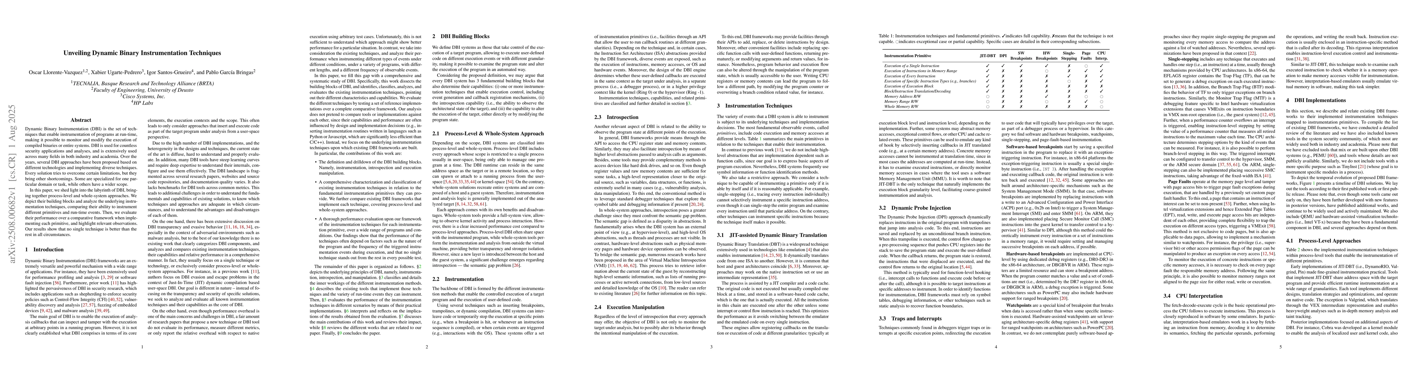 Dynamic Binary Instrumentation (DBI) is the set of techniques that enable instrumentation of programs at run-time, making it possible to monitor and modify the execution of compiled binaries or entire systems. DBI is used for countless security applications and analyses, and is extensively used across many fields in both industry and academia. Over the years, several DBI approaches have been proposed based on different technologies and implementing diverse techniques. Every solution tries to overcome certain limitations, but they sometimes bring other shortcomings. Some are specialized for one particular domain or task, while others have a wider scope. In this paper, we shed light into the labyrinth of DBI, bringing together process-level and whole-system approaches. We depict their building blocks and analyze the underlying instrumentation techniques, comparing their ability to instrument different primitives and run-time events. Then, we evaluate their performance when implementing each primitive, and highlight relevant observations. Our results show that no single technique is better than the rest in all circumstances.
