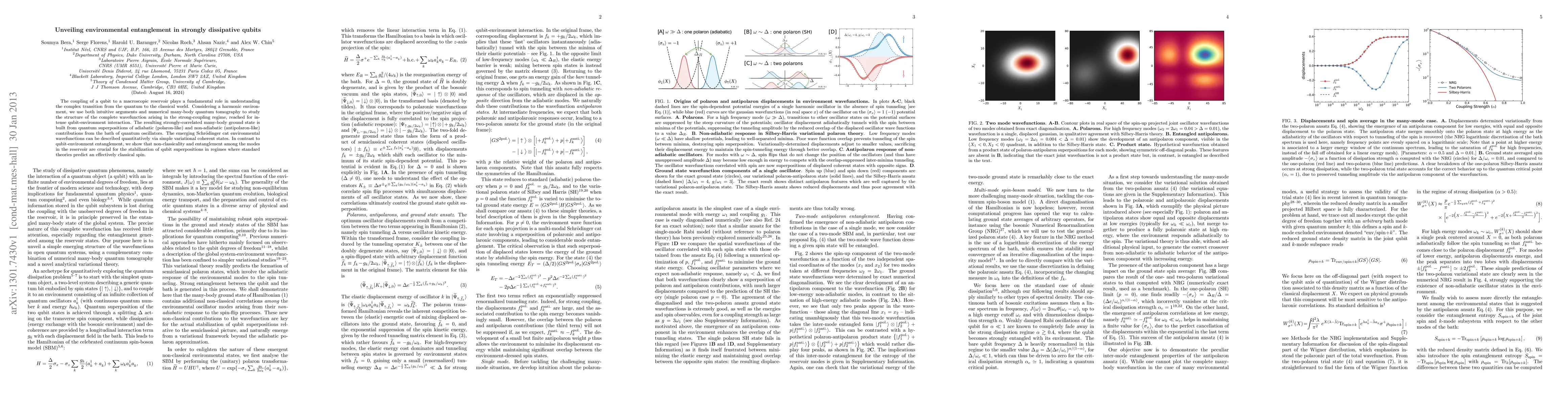 The coupling of a qubit to a macroscopic reservoir plays a fundamental role in understanding the complex transition from the quantum to the classical world. Considering a harmonic environment, we use both intuitive arguments and numerical many-body quantum tomography to study the structure of the complete wavefunction arising in the strong-coupling regime, reached for intense qubit-environment interaction. The resulting strongly-correlated many-body ground state is built from quantum superpositions of adiabatic (polaron-like) and non-adiabatic (antipolaron-like) contributions from the bath of quantum oscillators. The emerging Schr\"odinger cat environmental wavefunctions can be described quantitatively via simple variational coherent states. In contrast to qubit-environment entanglement, we show that non-classicality and entanglement among the modes in the reservoir are crucial for the stabilization of qubit superpositions in regimes where standard theories predict an effectively classical spin.