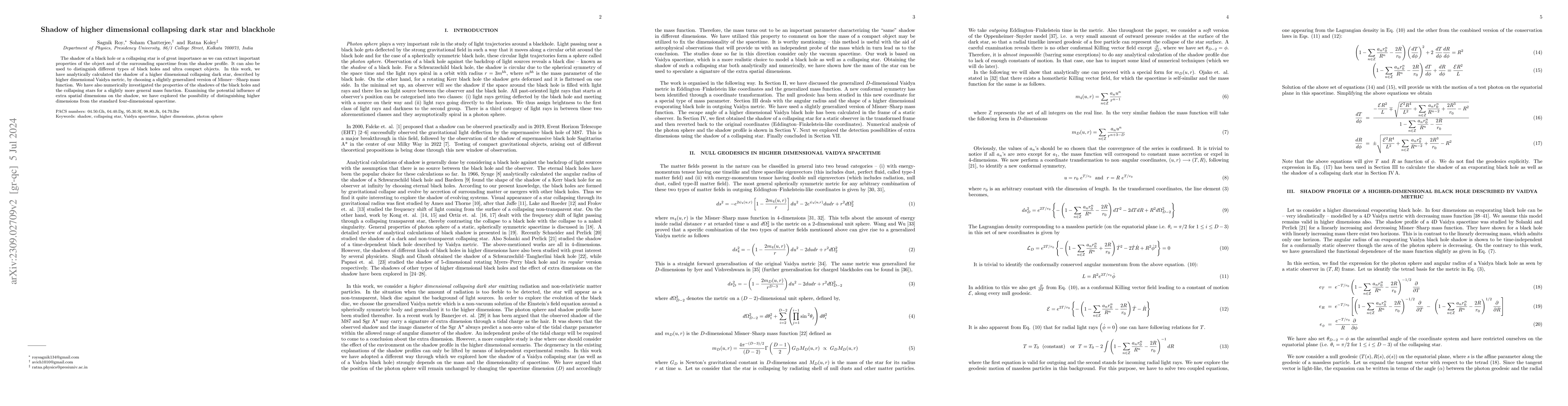 The shadow of a black hole or a collapsing star is of great importance as we can extract important properties of the object and of the surrounding spacetime from the shadow profile. It can also be used to distinguish different types of black holes and ultra compact objects. In this work, we have analytically calculated the shadow of a higher dimensional collapsing dark star, described by higher dimensional Vaidya metric, by choosing a slightly generalized version of Misner Sharp mass function. We have also numerically investigated the properties of the shadows of the black holes and the collapsing stars for a slightly more general mass function. Examining the potential influence of extra spatial dimensions on the shadow, we have explored the possibility of distinguishing higher dimensions from the standard four dimensional spacetime.
