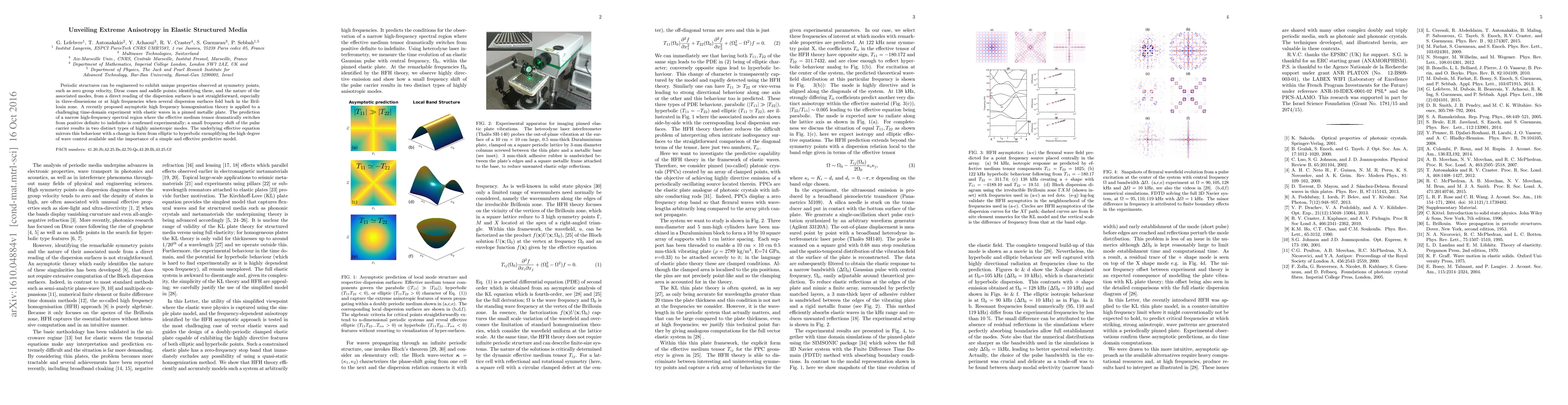 Periodic structures can be engineered to exhibit unique properties observed at symmetry points, such as zero group velocity, Dirac cones and saddle points; identifying these, and the nature of the associated modes, from a direct reading of the dispersion surfaces is not straightforward, especially in three-dimensions or at high frequencies when several dispersion surfaces fold back in the Brillouin zone. A recently proposed asymptotic high frequency homogenisation theory is applied to a challenging time-domain experiment with elastic waves in a pinned metallic plate. The prediction of a narrow high-frequency spectral region where the effective medium tensor dramatically switches from positive definite to indefinite is confirmed experimentally; a small frequency shift of the pulse carrier results in two distinct types of highly anisotropic modes. The underlying effective equation mirrors this behaviour with a change in form from elliptic to hyperbolic exemplifying the high degree of wave control available and the importance of a simple and effective predictive model.