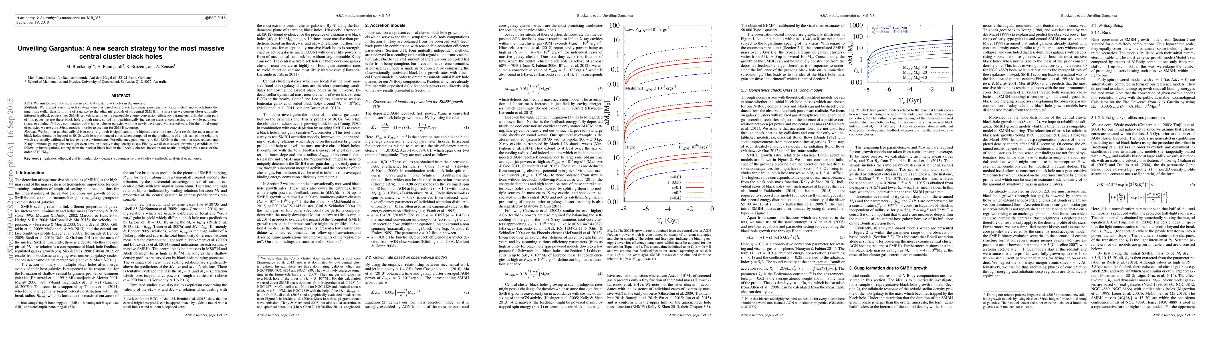 We aim to unveil the most massive central cluster black holes in the universe. We present a new search strategy which is based on a black hole mass gain sensitive 'calorimeter' and which links the innermost stellar density profile of a galaxy to the adiabatic growth of its central SMBH. In a first step we convert observationally inferred feedback powers into SMBH growth rates by using reasonable energy conversion efficiency parameters, $\epsilon$. In the main part of this paper we use these black hole growth rates, sorted in logarithmically increasing steps encompassing our whole parameter space, to conduct $N$-Body computations of brightest cluster galaxies with the newly developed MUESLI software. For the initial setup of galaxies we use core-Sersic models in order to account for SMBH scouring. We find that adiabatically driven core re-growth is significant at the highest accretion rates. As a result, the most massive black holes should be located in BCGs with less pronounced cores when compared to the predictions of empirical scaling relations which are usually calibrated in less extreme environments. For efficiency parameters $\epsilon<0.1$, BCGs in the most massive, relaxed and X-ray luminous galaxy clusters might even develop steeply rising density cusps. Finally, we discuss several promising candidates for follow up investigations, among them the nuclear black hole in the Phoenix cluster. Based on our results, it might have a mass of the order of $10^{11} M_\odot$.