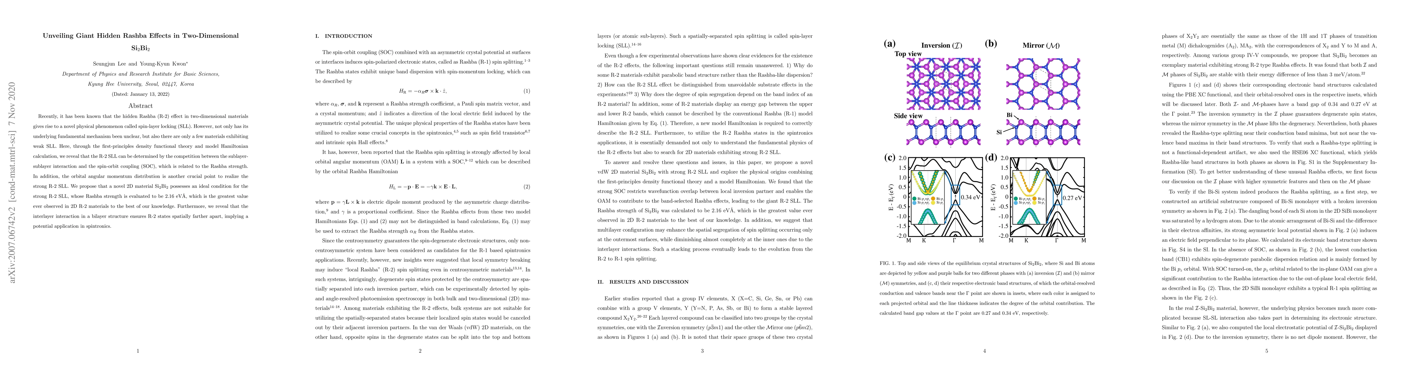 This paper reveals a novel two-dimensional material, Si$_2$Bi$_2$, exhibiting unprecedentedly strong hidden Rashba effects due to spin-layer locking, driven by the interplay between sublayer interactions and spin-orbit coupling. The material's interlayer interaction enhances the spatial separation of R-2 states, suggesting potential applications in spintronics.