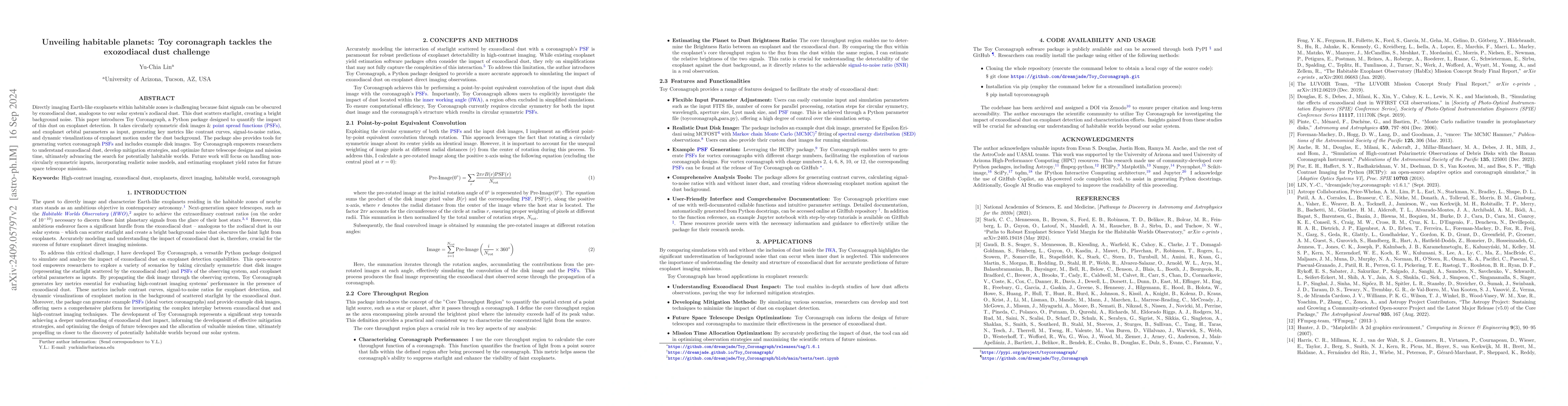 This paper introduces Toy Coronagraph, a Python package for analyzing the impact of exozodiacal dust on detecting Earth-like exoplanets. It generates key metrics and visualizations to help researchers understand and mitigate the effects of zodiacal dust, advancing the search for habitable planets.