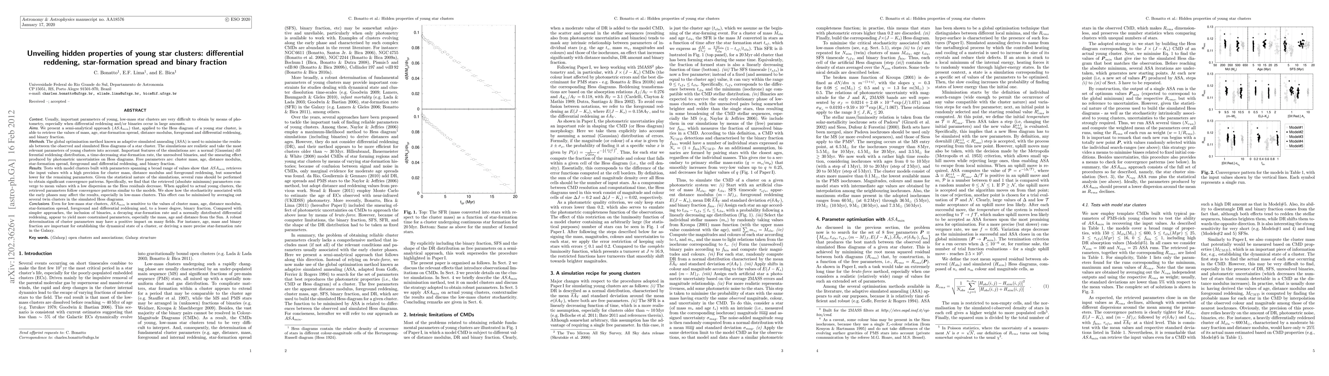 Usually, important parameters of young, low-mass star clusters are very difficult to obtain by means of photometry, especially when differential reddening and/or binaries occur in large amounts. We present a semi-analytical approach that, applied to the Hess diagram of a young star cluster, is able to retrieve the values of mass, age, star-formation spread, distance modulus, foreground and differential reddening, and binary fraction. The global optimisation method known as adaptive simulated annealing (ASA) is used to minimise the residuals between the observed and simulated Hess diagrams of a star cluster. The simulations are realistic and take the most relevant parameters of young clusters into account. Important features of the simulations are: a normal (Gaussian) differential reddening distribution, a time-decreasing star-formation rate, the unresolved binaries, and the smearing effect produced by photometric uncertainties on Hess diagrams. Free parameters are: cluster mass, age, distance modulus, star-formation spread, foreground and differential reddening, and binary fraction.