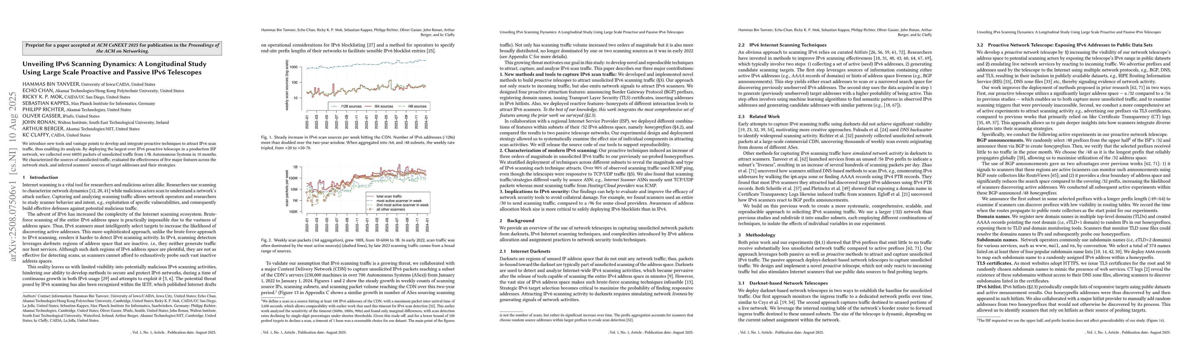 This work is novel in its scale and methodology, providing a longitudinal study using large-scale proactive and passive IPv6 telescopes, revealing unique insights into IPv6 scanning strategies and sources.
