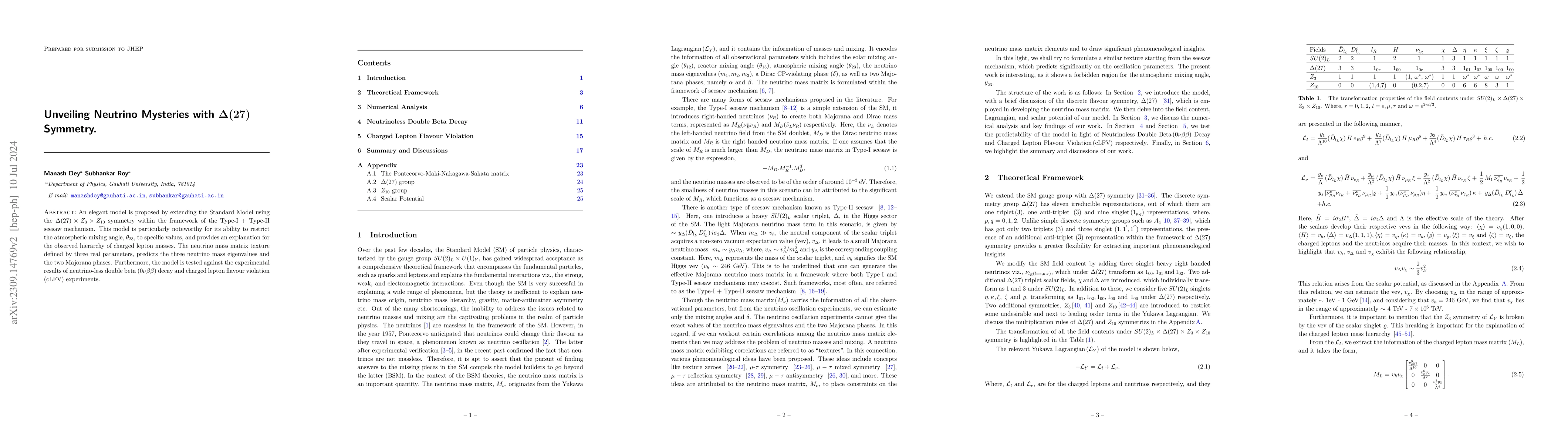 In the realm of neutrino physics, we grapple with mysteries like the origin of neutrino masses, the absence of a clear mass hierarchy, and the values of Majorana phases. To address these puzzles, we extend the Standard Model using $\Delta(27)$ symmetry within the Hybrid seesaw framework. We also introduce an additional $Z_{10}$ symmetry to constrain some undesirable terms in the Yukawa Lagrangian, resulting in a unique neutrino mass matrix texture with partial $\mu-\tau$ symmetry. In our study, we propose a novel lepton mixing matrix that, when connected to this texture, provides valuable phenomenological insights.