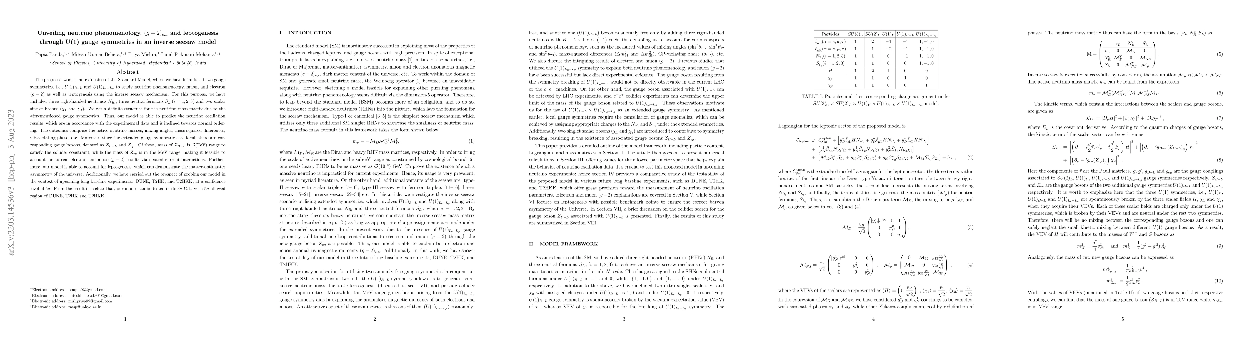 The proposed work is an extension of the Standard Model, where we have introduced two gauge symmetries, i.e., $U(1)_{B-L}$ and $U(1)_{L_e-L_\mu}$ to study neutrino phenomenology, muon, and electron $(g-2)$ as well as leptogenesis using the inverse seesaw mechanism. For this purpose, we have included three right-handed neutrinos $N_{R_i}$, three neutral fermions $S_{L_i} (i =1,2,3)$ and two scalar singlet bosons ($\chi_1$ and $\chi_2$). We get a definite structure for the neutrino mass matrix due to the aforementioned gauge symmetries. Thus, our model is able to predict the neutrino oscillation results, which are in accordance with the experimental data and is inclined towards normal ordering. The outcomes comprise the active neutrino masses, mixing angles, mass squared differences, CP-violating phase, etc. Moreover, since the extended gauge symmetries are local, there are corresponding gauge bosons, denoted as $Z_{B-L}$ and $Z_{e \mu}$. Of these, mass of $Z_{B-L}$ is $\mathcal{O}$(TeV) range to satisfy the collider constraint, while the mass of $Z_{e \mu}$ is in the MeV range, making it feasible to account for current electron and muon $(g-2)$ results via neutral current interactions. Furthermore, our model is able to account for leptogenesis, which can demonstrate the matter-antimatter asymmetry of the universe. Additionally, we have carried out the prospect of probing our model in the context of upcoming long baseline experiments: DUNE, T2HK, and T2HKK, at a confidence level of $5\sigma$. From the result it is clear that, our model can be tested in its $3\sigma$ C.L. with $5\sigma$ allowed region of DUNE, T2HK and T2HKK.