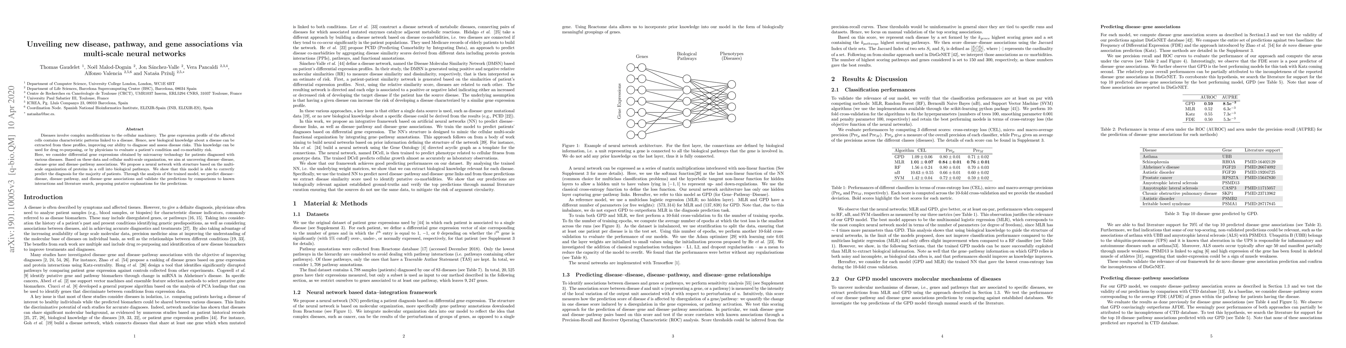 This paper utilizes multi-scale neural networks inspired by cellular organization to analyze gene expression data from microarrays, aiming to uncover new disease-disease, disease-gene, and disease-pathway associations. The proposed neural models successfully predict patient diagnoses and validate novel associations through comparisons with known interactions and literature.