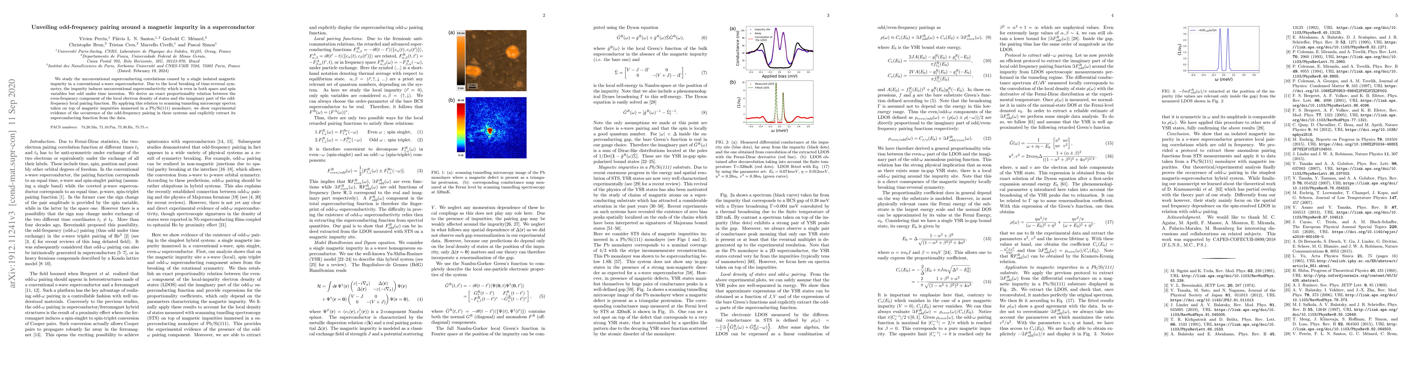 This paper explores unconventional superconductivity induced by a magnetic impurity in a conventional s-wave superconductor, revealing odd-frequency pairing due to broken time-reversal symmetry. The study derives a proportional relationship between the local electron density of states and the odd-frequency pairing function, confirmed experimentally via scanning tunneling microscopy on Pb/Si(111) monolayers.