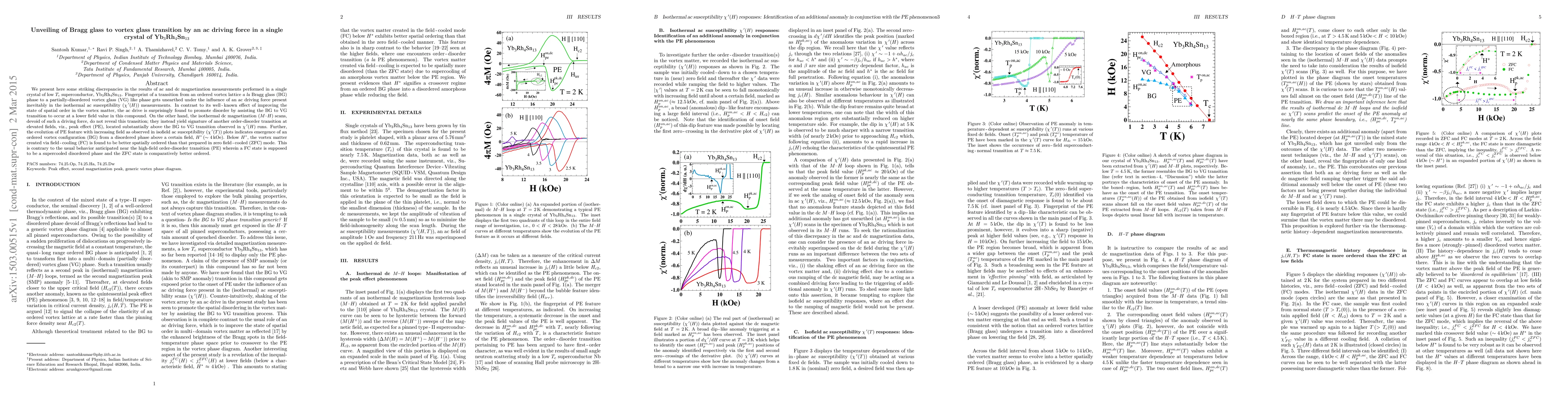 This study reveals a transition from a Bragg glass to a vortex glass phase in Yb3Rh4Sn13 under an ac driving force, contrasting with dc magnetization results that show a different order-disorder transition at higher fields. The ac drive promotes disorder, lowering the transition field compared to dc measurements.