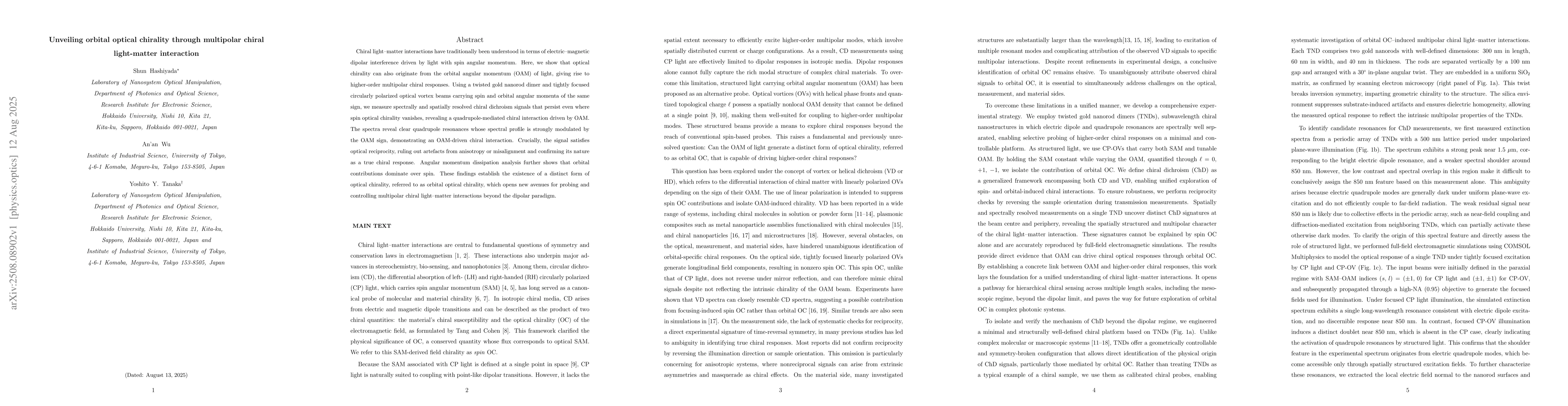 The paper presents a novel method for measuring and characterizing orbital optical chirality (OAM-OC) using spatially and spectrally resolved chiral dichroism (ChD) in a twisted gold nanorod dimer under circularly polarized optical vortex (CP-OV) beams.