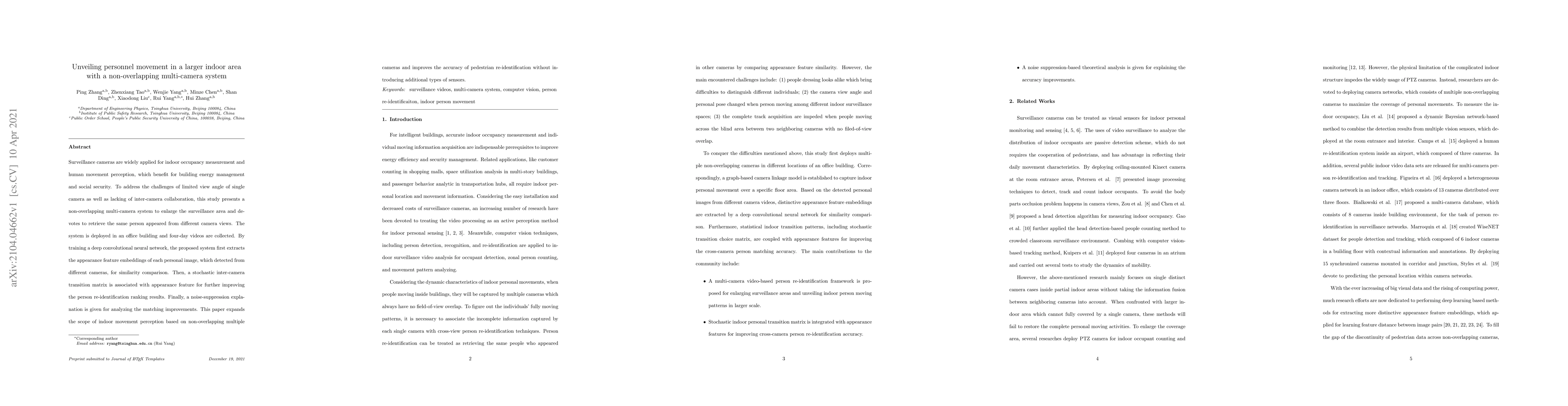 Surveillance cameras are widely applied for indoor occupancy measurement and human movement perception, which benefit for building energy management and social security. To address the challenges of limited view angle of single camera as well as lacking of inter-camera collaboration, this study presents a non-overlapping multi-camera system to enlarge the surveillance area and devotes to retrieve the same person appeared from different camera views. The system is deployed in an office building and four-day videos are collected. By training a deep convolutional neural network, the proposed system first extracts the appearance feature embeddings of each personal image, which detected from different cameras, for similarity comparison. Then, a stochastic inter-camera transition matrix is associated with appearance feature for further improving the person re-identification ranking results. Finally, a noise-suppression explanation is given for analyzing the matching improvements. This paper expands the scope of indoor movement perception based on non-overlapping multiple cameras and improves the accuracy of pedestrian re-identification without introducing additional types of sensors.