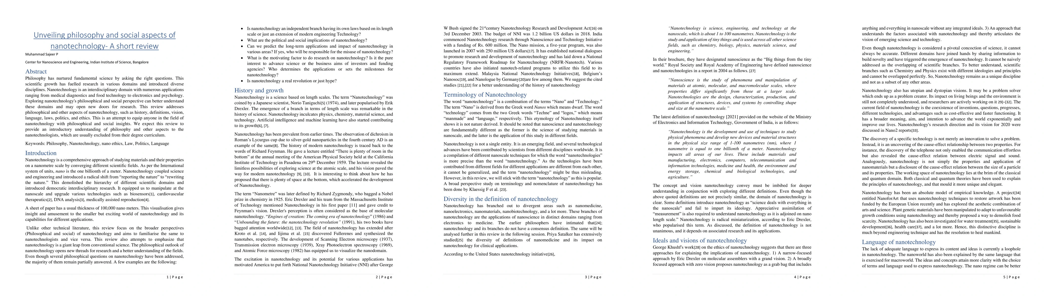 Philosophy has nurtured fundamental science by asking the right questions. This scientific growth has fuelled research in various domains and introduced diverse disciplines. Nanotechnology is an interdisciplinary domain with numerous applications ranging from medical diagnostics and food technology to electronics and psychology. Exploring nanotechnology's philosophical and social perspective can better understand these domains and may open new doors for research. This review addresses philosophical and other aspects of nanotechnology, such as history, definitions, vision, language, laws, politics, and ethics. This is an attempt to equip anyone in the field of nanotechnology with philosophical and social insights. We expect this review to provide an introductory understanding of philosophy and other aspects to the nanotechnologists, which are usually excluded from their degree curriculum.