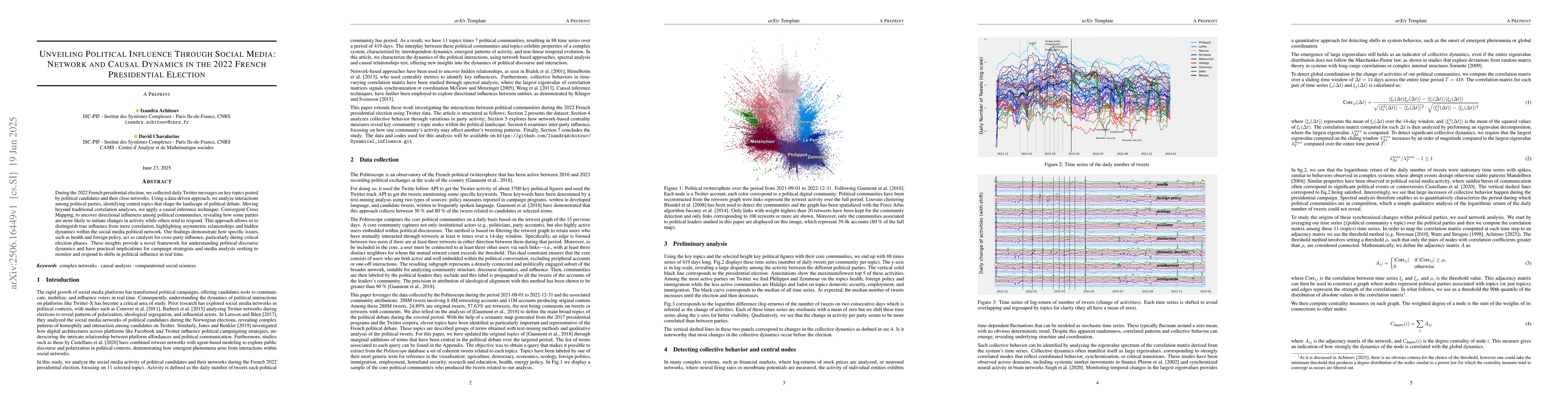 During the 2022 French presidential election, we collected daily Twitter messages on key topics posted by political candidates and their close networks. Using a data-driven approach, we analyze interactions among political parties, identifying central topics that shape the landscape of political debate. Moving beyond traditional correlation analyses, we apply a causal inference technique: Convergent Cross Mapping, to uncover directional influences among political communities, revealing how some parties are more likely to initiate changes in activity while others tend to respond. This approach allows us to distinguish true influence from mere correlation, highlighting asymmetric relationships and hidden dynamics within the social media political network. Our findings demonstrate how specific issues, such as health and foreign policy, act as catalysts for cross-party influence, particularly during critical election phases. These insights provide a novel framework for understanding political discourse dynamics and have practical implications for campaign strategists and media analysts seeking to monitor and respond to shifts in political influence in real time.