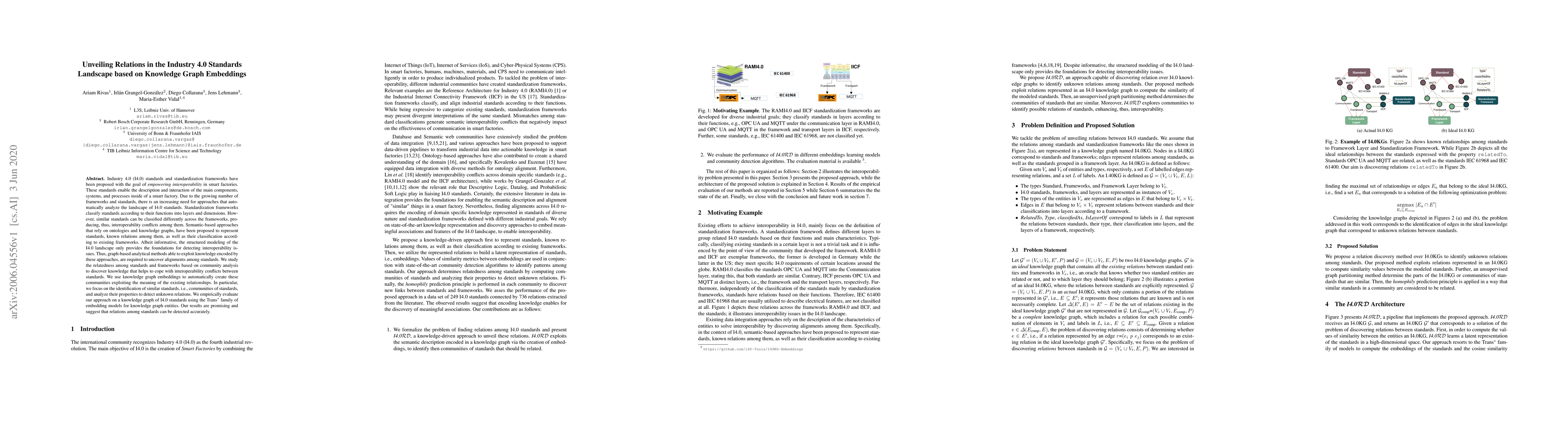 Industry~4.0 (I4.0) standards and standardization frameworks have been proposed with the goal of \emph{empowering interoperability} in smart factories. These standards enable the description and interaction of the main components, systems, and processes inside of a smart factory. Due to the growing number of frameworks and standards, there is an increasing need for approaches that automatically analyze the landscape of I4.0 standards. Standardization frameworks classify standards according to their functions into layers and dimensions. However, similar standards can be classified differently across the frameworks, producing, thus, interoperability conflicts among them. Semantic-based approaches that rely on ontologies and knowledge graphs, have been proposed to represent standards, known relations among them, as well as their classification according to existing frameworks. Albeit informative, the structured modeling of the I4.0 landscape only provides the foundations for detecting interoperability issues. Thus, graph-based analytical methods able to exploit knowledge encoded by these approaches, are required to uncover alignments among standards. We study the relatedness among standards and frameworks based on community analysis to discover knowledge that helps to cope with interoperability conflicts between standards. We use knowledge graph embeddings to automatically create these communities exploiting the meaning of the existing relationships. In particular, we focus on the identification of similar standards, i.e., communities of standards, and analyze their properties to detect unknown relations. We empirically evaluate our approach on a knowledge graph of I4.0 standards using the Trans$^*$ family of embedding models for knowledge graph entities. Our results are promising and suggest that relations among standards can be detected accurately.