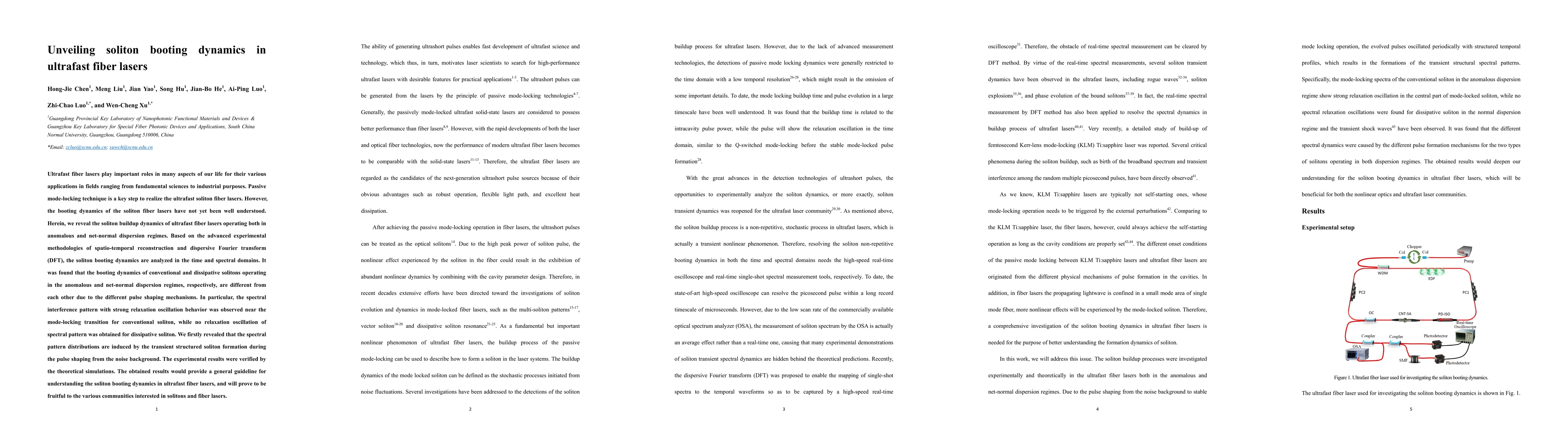 This paper investigates the soliton booting dynamics in ultrafast fiber lasers using advanced experimental techniques. It reveals distinct pulse shaping mechanisms for conventional and dissipative solitons in different dispersion regimes, highlighting spectral interference patterns and relaxation oscillations near the mode-locking transition. The findings provide insights into the initial formation of solitons in fiber lasers.