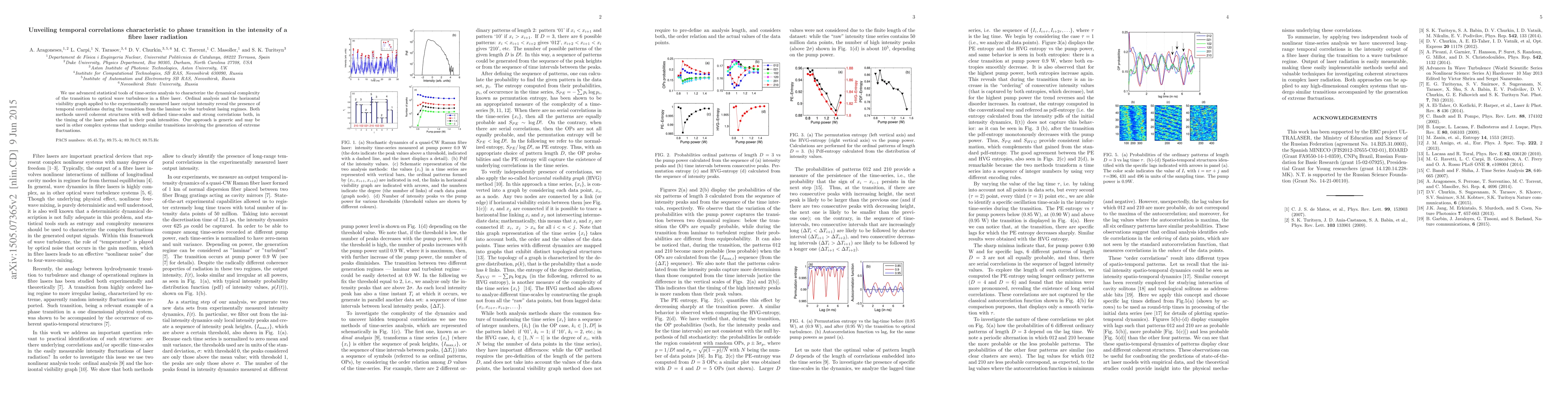 We use advanced statistical tools of time-series analysis to characterize the dynamical complexity of the transition to optical wave turbulence in a fibre laser. Ordinal analysis and the horizontal visibility graph applied to the experimentally measured laser output intensity reveal the presence of temporal correlations during the transition from the laminar to the turbulent lasing regimes. Both methods unveil coherent structures with well defined time-scales and strong correlations both, in the timing of the laser pulses and in their peak intensities. Our approach is generic and may be used in other complex systems that undergo similar transitions involving the generation of extreme fluctuations.