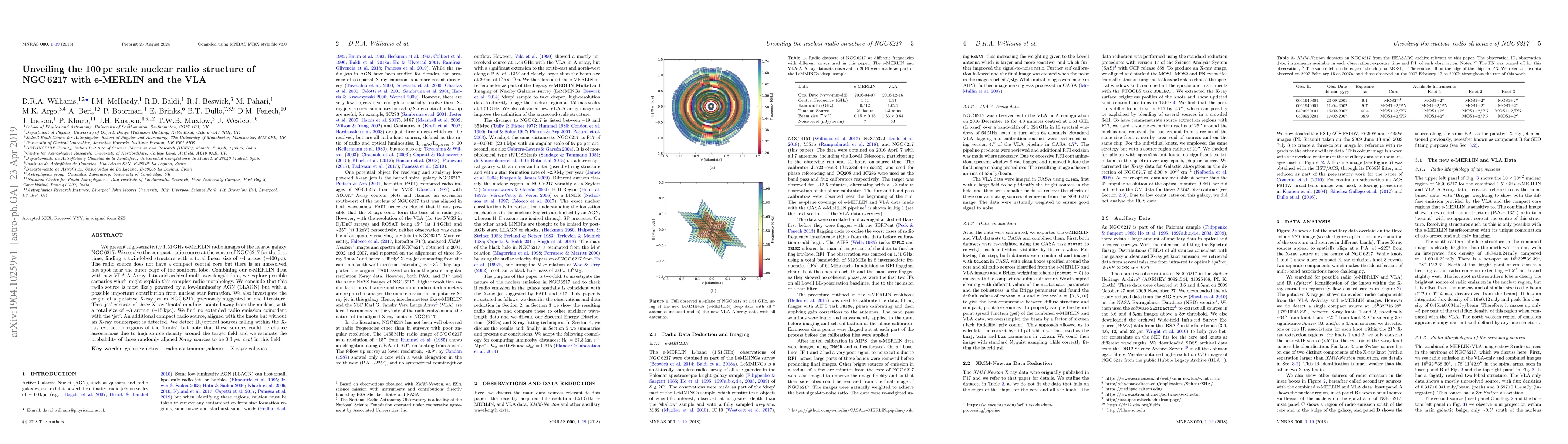 We present high-sensitivity 1.51 GHz e-MERLIN radio images of the nearby galaxy NGC 6217. We resolve the compact radio source at the centre of NGC 6217 for the first time, finding a twin-lobed structure with a total linear size of ~4 arcsec (~400pc). The radio source does not have a compact central core but there is an unresolved hot spot near the outer edge of the southern lobe. Combining our e-MERLIN data with new VLA A-Array data and archival multi-wavelength data, we explore possible scenarios which might explain this complex radio morphology. We conclude that this radio source is most likely powered by a low-luminosity AGN (LLAGN) but with a possible important contribution from nuclear star formation. We also investigate the origin of a putative X-ray jet in NGC 6217, previously suggested in the literature. This `jet' consists of three X-ray `knots' in a line, pointed away from the nucleus, with a total size of ~3 arcmin (~15 kpc). We find no extended radio emission coincident with the `jet'. An additional compact radio source, aligned with the knots but without an X-ray counterpart is detected. We detect IR/optical sources falling within the X-ray extraction regions of the `knots', but note that these sources could be chance associations due to high source density around the target field and we estimate the probability of three randomly aligned X-ray sources to be 0.3 per cent in this field.