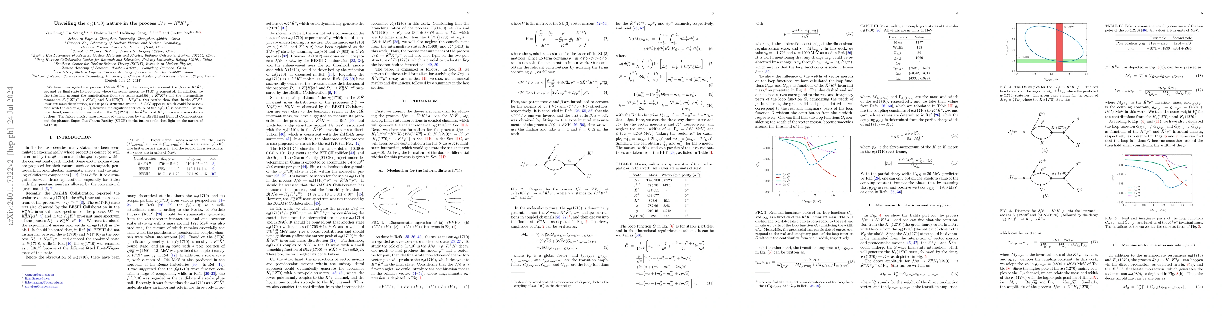 This study investigates the $J/\psi \to {\bar{K}}^0K^+\rho^-$ process, revealing a significant peak around 1.8 GeV associated with the $a_0(1710)$ meson in the ${{\bar{K}}^0K^+}$ invariant mass distribution, suggesting its dynamic generation. Future precise measurements by BESIII, BelleII, and the super tau charm facility could further elucidate the nature of $a_0(1710)$.