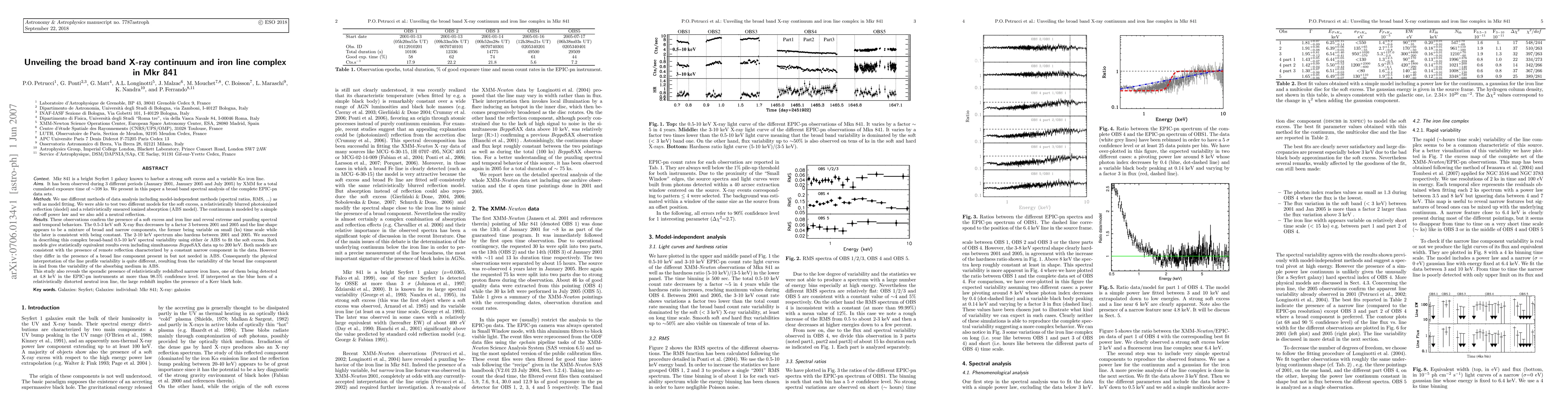 Mkr 841 is a bright Seyfert 1 galaxy known to harbor a strong soft excess and a variable K$\alpha$ iron line. It has been observed during 3 different periods by XMM for a total cumulated exposure time of $\sim$108 ks. We present in this paper a broad band spectral analysis of the complete EPIC-pn data sets. We were able to test two different models for the soft excess, a relativistically blurred photoionized reflection (\r model) and a relativistically smeared ionized absorption (\a model). The continuum is modeled by a simple cut-off power law and we also add a neutral reflection. These observations reveal the extreme and puzzling spectral and temporal behaviors of the soft excess and iron line. The 0.5-3 keV soft X-ray flux decreases by a factor 3 between 2001 and 2005 and the line shape appears to be a mixture of broad and narrow components. We succeed in describing this complex broad-band 0.5-10 keV spectral variability using either \r or \a to fit the soft excess. Both models give statistically equivalent results even including simultaneous BeppoSAX data up to 200 keV. Both models are consistent with the presence of remote reflection characterized by a constant narrow component in the data. However they differ in the presence of a broad line component present in \r but not needed in \a. This study also reveals the sporadic presence of relativistically redshifted narrow iron lines.