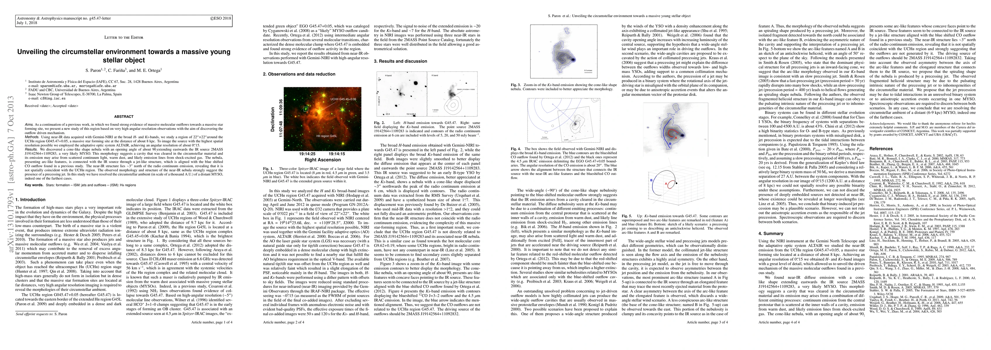 As a continuation of a previous work, in which we found strong evidence of massive molecular outflows towards a massive star forming site, we present a new study of this region based on very high angular resolution observations with the aim of discovering the outflow driven mechanism. Using near-IR data acquired with Gemini-NIRI at the broad H- and Ks-bands, we study a region of 22" x 22" around the UCHII region G045.47+0.05, a massive star forming site at the distance of about 8 kpc. To image the source with the highest spatial resolution possible we employed the adaptative optic system ALTAIR, achieving an angular resolution of about 0.15". We discovered a cone-like shape nebula with an opening angle of about 90 degree extending eastwards the IR source 2MASS J19142564+1109283, a very likely MYSO. This morphology suggests a cavity that was cleared in the circumstellar material and its emission may arise from scattered continuum light, warm dust, and likely emission lines from shock-excited gas. The nebula, presenting arc-like features, is connected with the IR source through a jet-like structure, which is aligned with the blue shifted CO outflow found in a previous study. The near-IR structure lies ~3" north of the radio continuum emission, revealing that it is not spatially coincident with the UCHII region. The observed morphology and structure of the near-IR nebula strongly suggest the presence of a precessing jet. In this study we have resolved the circumstellar ambient (in scale of a thousand A.U.) of a distant MYSO, indeed one of the farthest cases.