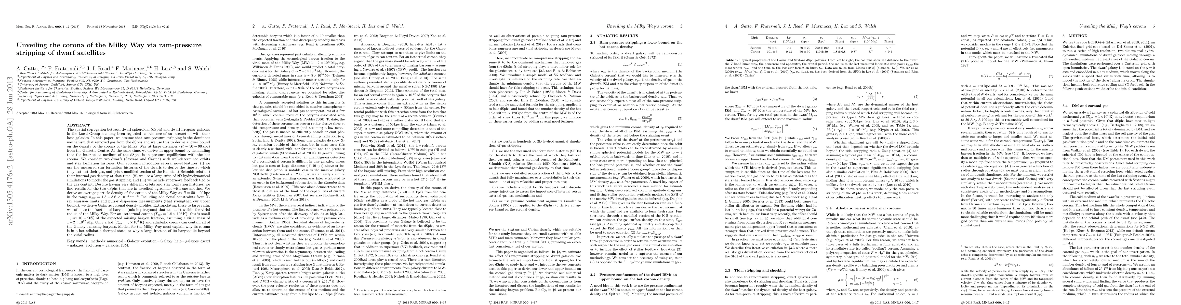 This paper investigates the Milky Way's corona density via ram-pressure stripping of dwarf satellites, deriving a range of 1.3-3.6 x 10^{-4} cm^{-3} for distances 50-90 kpc from the Galactic center. It concludes that only a hot, adiabatic corona can account for the Galaxy's missing baryons.