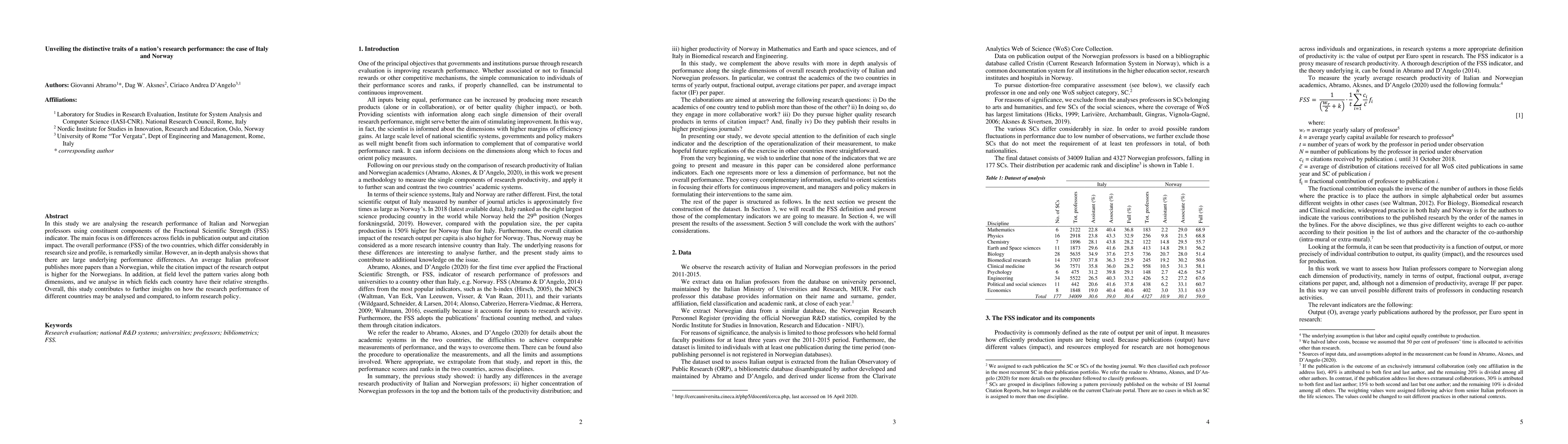 In this study we are analysing the research performance of Italian and Norwegian professors using constituent components of the Fractional Scientific Strength (FSS) indicator. The main focus is on differences across fields in publication output and citation impact. The overall performance (FSS) of the two countries, which differ considerably in research size and profile, is remarkedly similar. However, an in-depth analysis shows that there are large underlying performance differences. An average Italian professor publishes more papers than a Norwegian, while the citation impact of the research output is higher for the Norwegians. In addition, at field level the pattern varies along both dimensions, and we analyse in which fields each country have their relative strengths. Overall, this study contributes to further insights on how the research performance of different countries may be analysed and compared, to inform research policy.