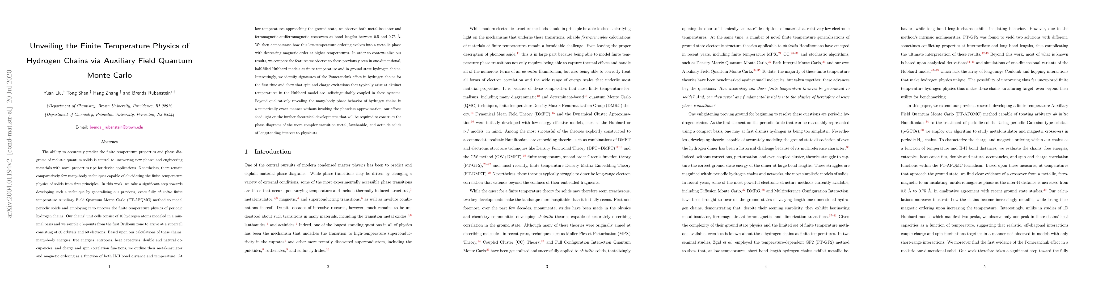 The ability to accurately predict the finite temperature properties of realistic quantum solids is central to uncovering new phases and engineering materials with novel properties. Nonetheless, there remain comparatively few many-body techniques capable of elucidating the finite temperature physics of solids from first principles. In this work, we take a significant step towards developing such a technique by generalizing our previous, fully ab initio finite temperature Auxiliary Field Quantum Monte Carlo (FT-AFQMC) method to model periodic solids and employing it to uncover the finite temperature physics of periodic hydrogen chains. Based upon our calculations of these chains' many-body thermodynamic quantities and correlation functions, we outline their metal-insulator and magnetic ordering as a function of both H-H bond distance and temperature. At low temperatures approaching the ground state, we observe both metal-insulator and ferromagnetic-antiferromagnetic crossovers at bond lengths between 0.5 and 0.75 {\AA}. We then demonstrate how this low-temperature ordering evolves into a metallic phase with decreasing magnetic order at higher temperatures. By comparing the features we observe to those previously seen in one-dimensional, half-filled Hubbard models at finite temperature and in ground state hydrogen chains, interestingly, we identify signatures of the Pomeranchuk effect in hydrogen chains for the first time and show that spin and charge excitations that typically arise at distinct temperatures in the Hubbard model are indistinguishably coupled in these systems. Beyond qualitatively revealing the many-body phase behavior of hydrogen chains, our efforts shed light on the further theoretical developments that will be required to construct the phase diagrams of the more complex transition metal, lanthanide, and actinide solids of longstanding interest to physicists.