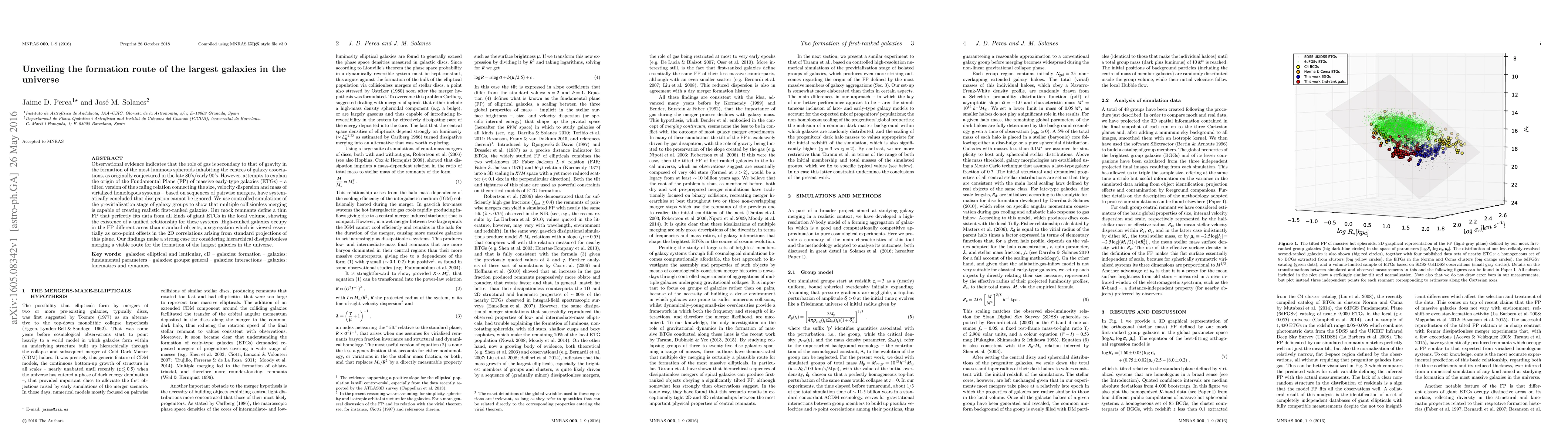 Observational evidence indicates that the role of gas is secondary to that of gravity in the formation of the most luminous spheroids inhabiting the centres of galaxy associations, as originally conjectured in the late 80's/early 90's. However, attempts to explain the origin of the Fundamental Plane (FP) of massive early-type galaxies (ETGs) -- a tilted version of the scaling relation connecting the size, velocity dispersion and mass of virialized homologous systems -- based on sequences of pairwise mergers, have systematically concluded that dissipation cannot be ignored. We use controlled simulations of the previrialization stage of galaxy groups to show that multiple collisionless merging is capable of creating realistic first-ranked galaxies. Our mock remnants define a thin FP that perfectly fits data from all kinds of giant ETGs in the local volume, showing the existence of a unified relationship for these systems. High-ranked galaxies occupy in the FP different areas than standard objects, a segregation which is viewed essentially as zero-point offsets in the 2D correlations arising from standard projections of this plane. Our findings make a strong case for considering hierarchical dissipationless merging a viable route for the formation of the largest galaxies in the universe.