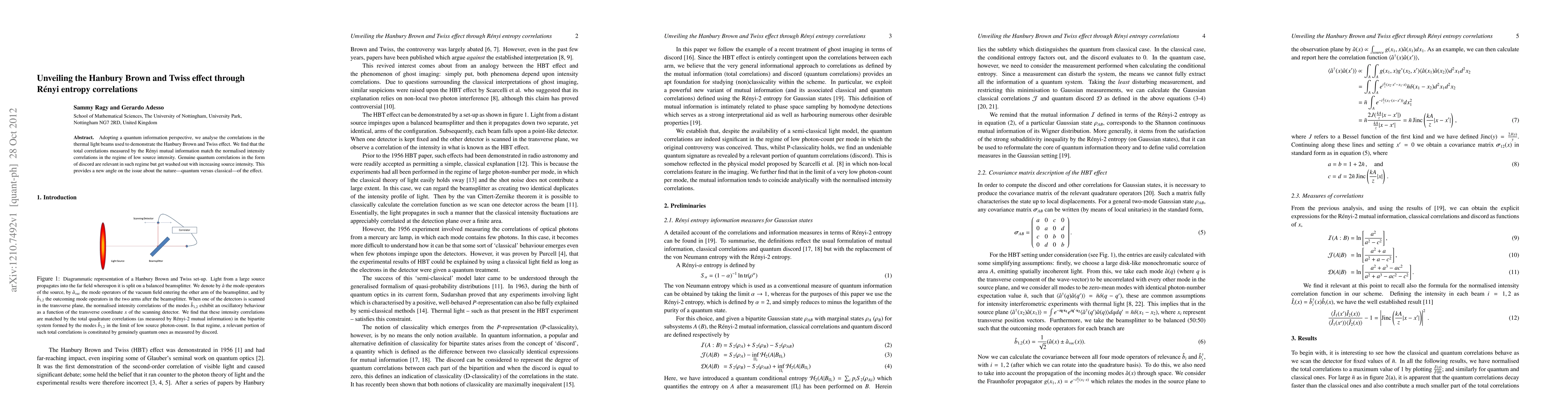 This paper examines the Hanbury Brown and Twiss effect using Renyi entropy correlations, finding that low-intensity thermal light beams exhibit quantum-like mutual information, while classical behavior dominates at higher intensities, offering new insights into the quantum versus classical nature of the effect.