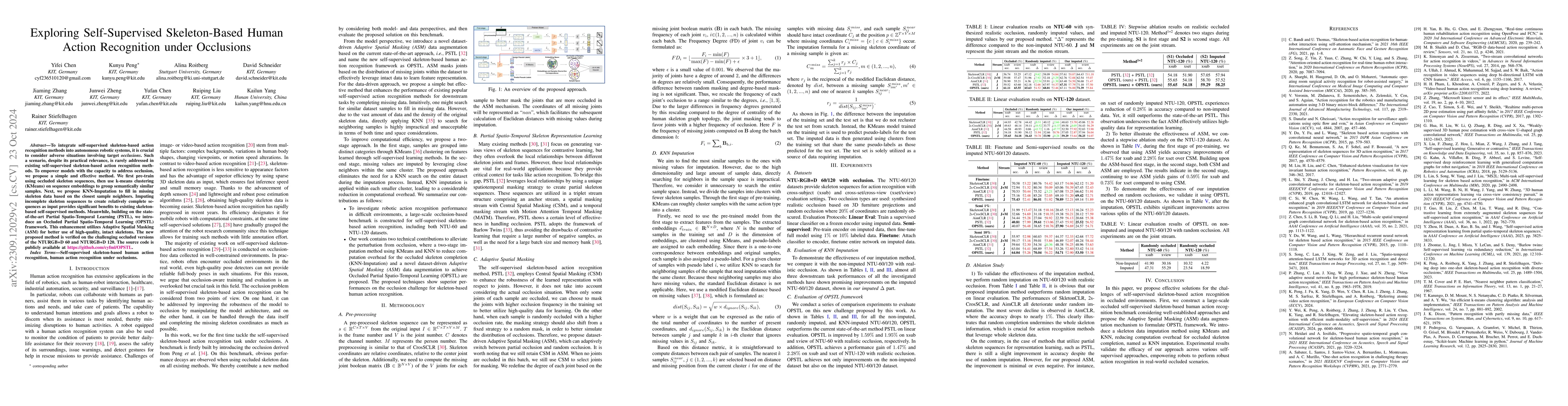 To integrate action recognition methods into autonomous robotic systems, it is crucial to consider adverse situations involving target occlusions. Such a scenario, despite its practical relevance, is rarely addressed in existing self-supervised skeleton-based action recognition methods. To empower robots with the capacity to address occlusion, we propose a simple and effective method. We first pre-train using occluded skeleton sequences, then use k-means clustering (KMeans) on sequence embeddings to group semantically similar samples. Next, we employ K-nearest-neighbor (KNN) to fill in missing skeleton data based on the closest sample neighbors. Imputing incomplete skeleton sequences to create relatively complete sequences as input provides significant benefits to existing skeleton-based self-supervised models. Meanwhile, building on the state-of-the-art Partial Spatio-Temporal Learning (PSTL), we introduce an Occluded Partial Spatio-Temporal Learning (OPSTL) framework. This enhancement utilizes Adaptive Spatial Masking (ASM) for better use of high-quality, intact skeletons. The effectiveness of our imputation methods is verified on the challenging occluded versions of the NTURGB+D 60 and NTURGB+D 120. The source code will be made publicly available at https://github.com/cyfml/OPSTL.