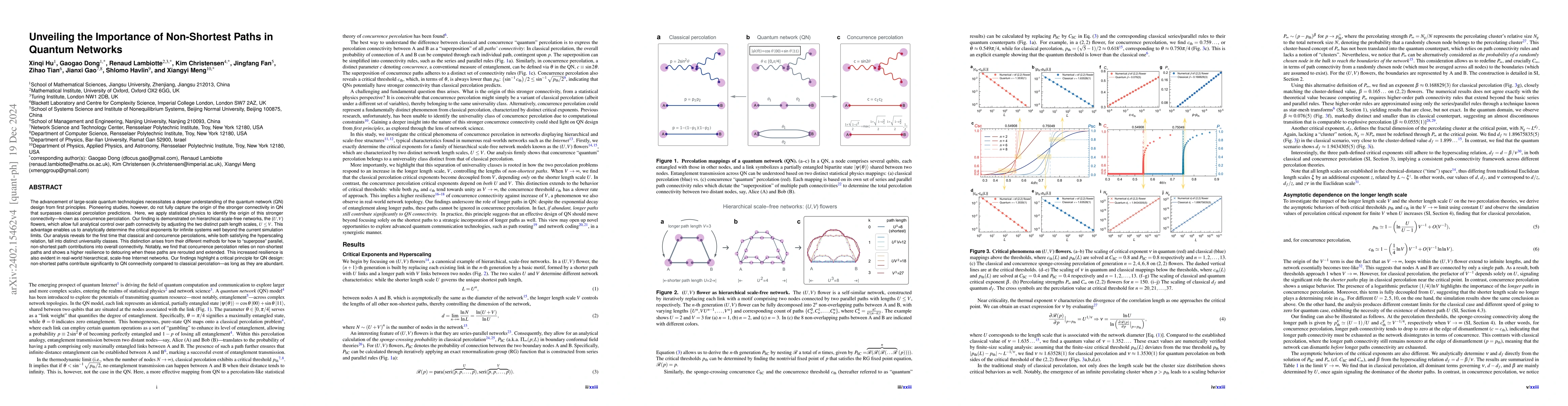 The advancement of quantum communication technologies is calling for a better understanding of quantum network (QN) design from first principles, approached through network science. Pioneering studies have established a classical percolation mapping to model the task of entanglement transmission across QN. Yet, this mapping does not capture the stronger, yet not fully understood connectivity observed in QNs, which facilitates more efficient entanglement transmission than predicted by classical percolation. In this work, we explore the critical phenomena of the potential statistical theory underlying this enhanced connectivity, known as concurrence percolation. Compared to classical percolation, the concurrence percolation mapping employs a unique approach of "superposing" path connectivities, utilizing a different set of path connectivity rules, thereby boosting the overall network connectivity. Firstly, we analytically derive the percolation critical exponents for hierarchical, scale-free networks, particularly the UV flower model, characterized by two distinct network length scales, U$\leq$V. Our analysis confirms that classical and concurrence percolations, albeit both satisfying the hyperscaling relation, fall into separate universality classes. Most importantly, this separation stems from their different treatment of non-shortest path contributions to overall connectivity. Notably, as the longer path scale V increases, concurrence percolation retains unignorable dependence of both its critical threshold and critical exponents on V and thus, comparing with its classical counterpart, shows a higher resilience to the weakening of non-shortest paths. This higher resilience is also observed in real-world network topology, e.g., the Internet. Our findings reveal a first principle for QN design: longer paths still contribute significantly to QN connectivity -- as long as they are abundant.