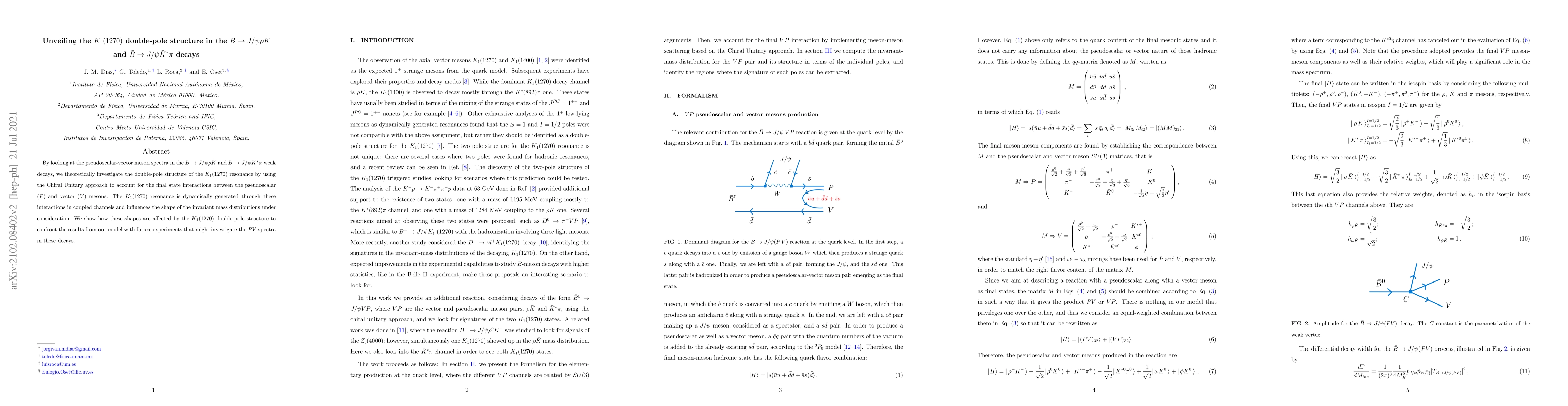 By looking at the pseudoscalar-vector meson spectra in the $\bar{B}\to J/\psi \rho\bar{K}$ and $\bar{B}\to J/\psi \bar{K}^*\pi$ weak decays, we theoretically investigate the double-pole structure of the $K_1(1270)$ resonance by using the Chiral Unitary approach to account for the final state interactions between the pseudoscalar and vector mesons. The $K_1(1270)$ resonance appears as dynamically generated through these interactions in coupled channels and influence the shape of the invariant mass distributions under consideration. We show how those shapes are affected by the $K_1(1270)$ double-pole structure to confront the results from our model with future experiments that might investigate the $PV$ spectra in these decays.