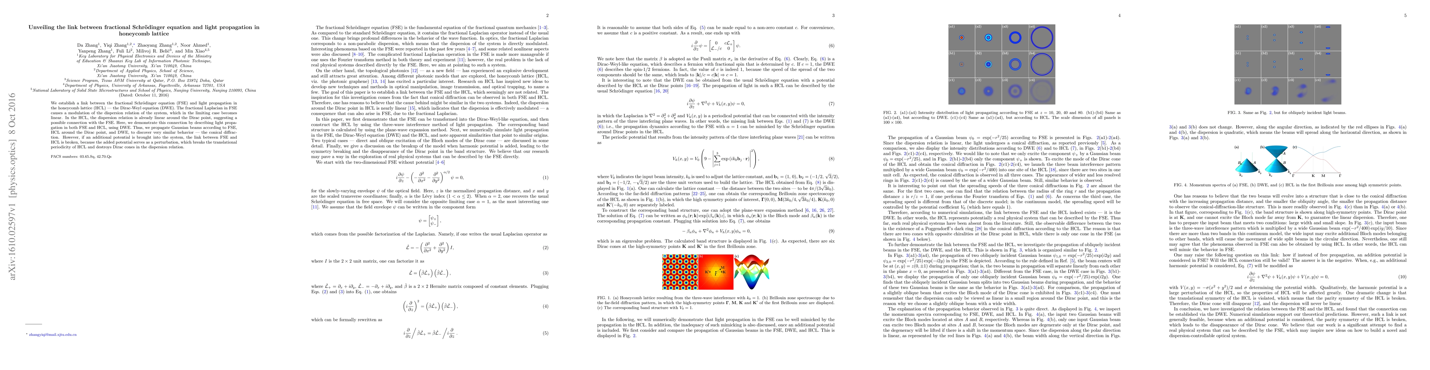 We establish a link between the fractional Schr\"odinger equation (FSE) and light propagation in the honeycomb lattice (HCL) - the Dirac-Weyl equation (DWE). The fractional Laplacian in FSE causes a modulation of the dispersion relation of the system, which in the limiting case becomes linear. In the HCL, the dispersion relation is already linear around the Dirac point, suggesting a possible connection with the FSE. Here, we demonstrate this connection by describing light propagation in both FSE and HCL, using DWE. Thus, we propagate Gaussian beams according to FSE, HCL around the Dirac point, and DWE, to discover very similar behavior - the conical diffraction. However, if an additional potential is brought into the system, the link between FSE and HCL is broken, because the added potential serves as a perturbation, which breaks the translational periodicity of HCL and destroys Dirac cones in the dispersion relation.