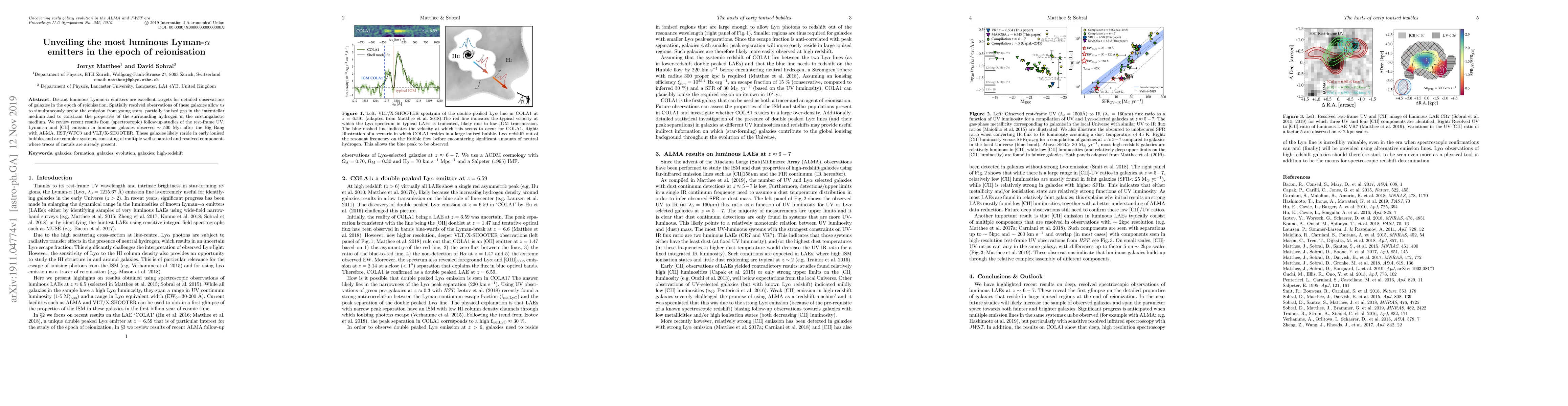 This paper reviews observations of the most luminous Lyman-alpha emitters from the epoch of reionisation, highlighting their complex structures and the insights gained into young stars, ionised gas, and circumgalactic medium properties from spectroscopic follow-up studies using ALMA, HST/WFC3, and VLT/X-SHOOTER.