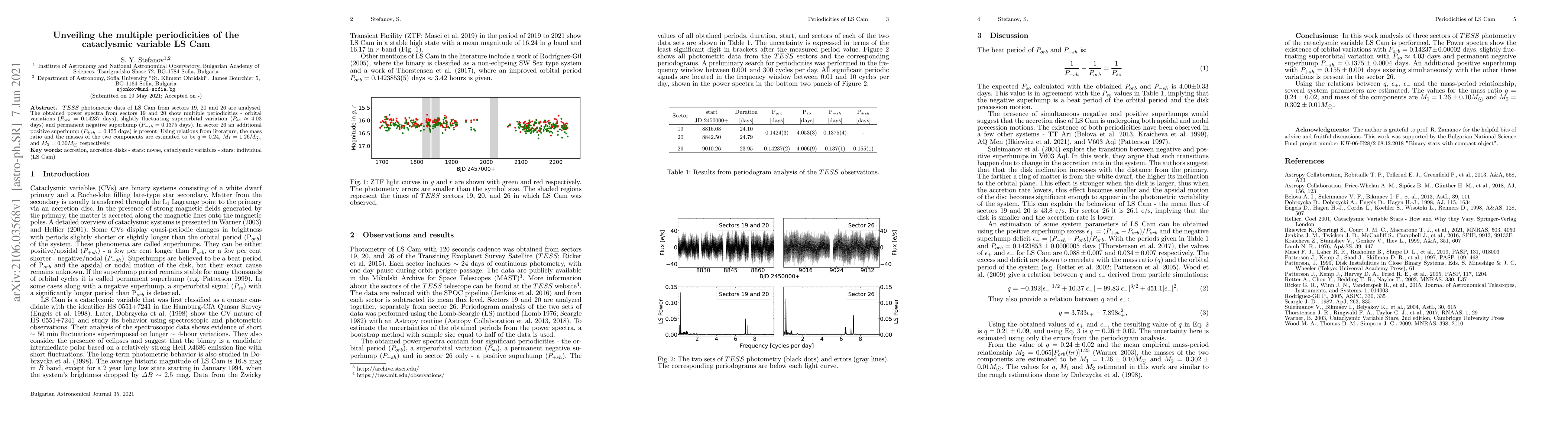 $TESS$ photometric data of LS~Cam from sectors 19, 20 and 26 are analysed. The obtained power spectra from sectors 19 and 20 show multiple periodicities - orbital variations ($P_{orb} = 0.14237$ days), slightly fluctuating superorbital variation ($ P_{so} \approx 4.03$ days) and permanent negative superhump ($P_{-sh} = 0.1375$ days). In sector 26 an additional positive superhump ($P_{+sh} = 0.155$ days) is present. Using relations from literature, the mass ratio and the masses of the two components are estimated to be $q =0.24$, $M_1 = 1.26M_\odot$, and $M_2 = 0.30 M_\odot$ respectively.