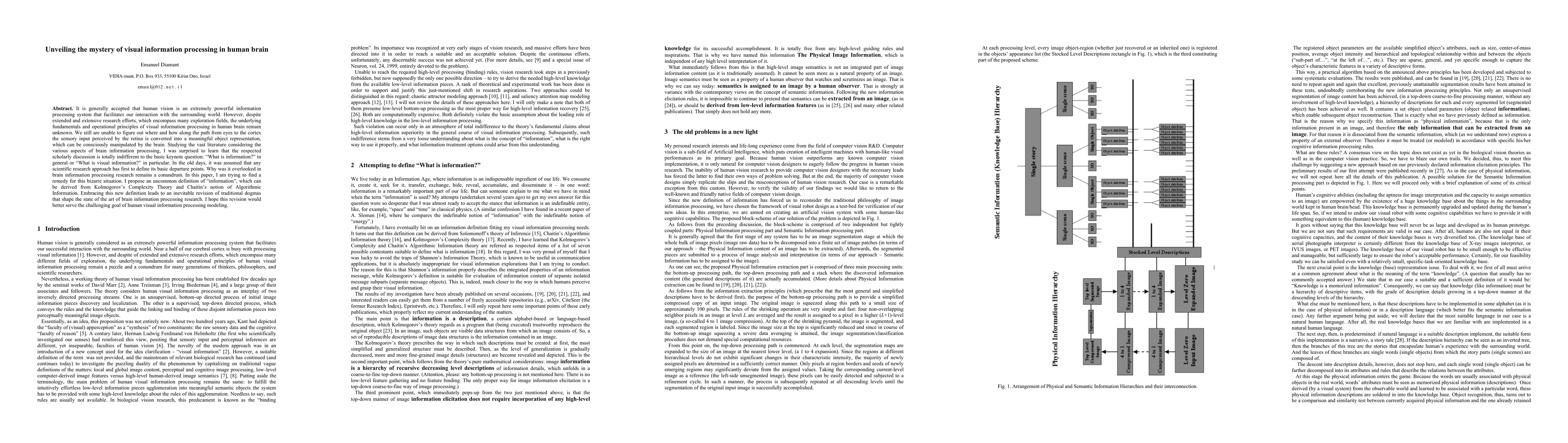 This paper addresses the lack of a fundamental understanding of visual information processing in the human brain, proposing a new definition of "information" based on Kolmogorov's Complexity Theory and Chaitin's Algorithmic Information to revise traditional research approaches and better model human visual information processing.