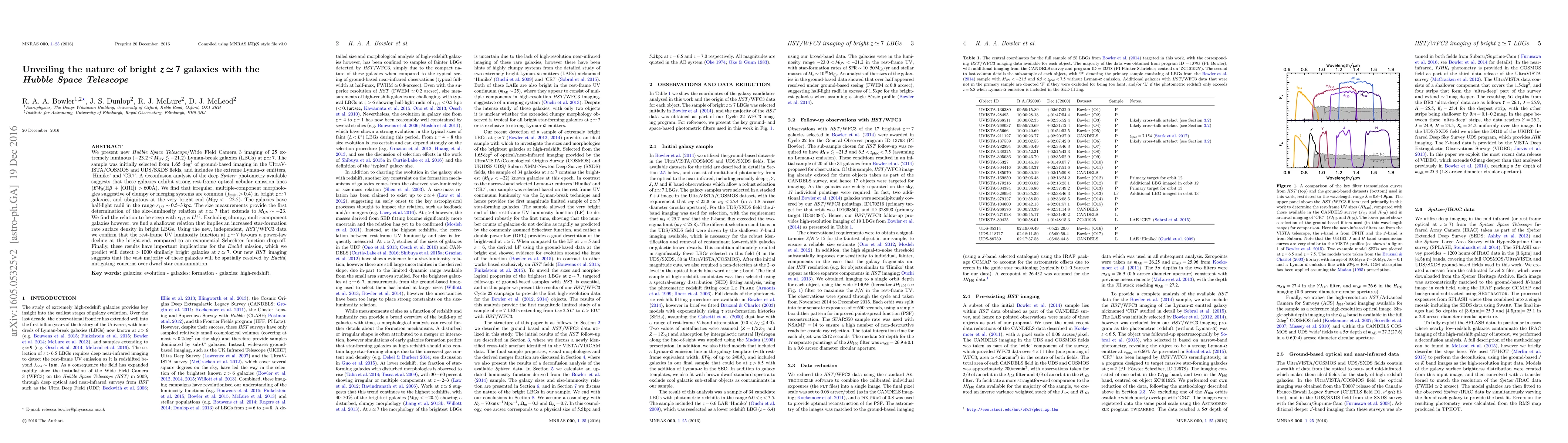 New Hubble Space Telescope observations reveal bright z ~ 7 galaxies with strong rest-frame optical emission lines and irregular morphologies, suggesting clumpy or merging systems, and provide the first size-luminosity relation at z ~ 7.
