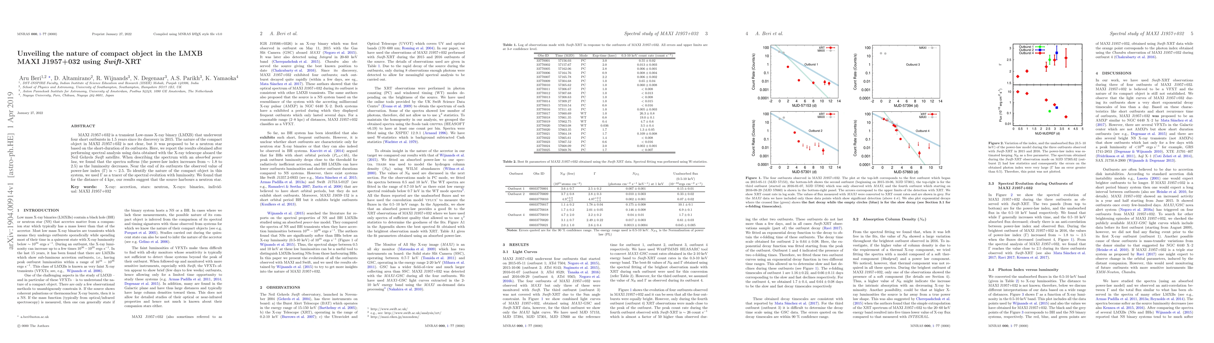 MAXI J1957+032 is a transient Low-mass X-ray binary (LMXB) that underwent four short outbursts in 1.5 years since its discovery in 2015. The nature of the compact object in MAXI J1957+032 is not clear, but it was proposed to be a neutron star based on the short-duration of its outbursts. Here, we report the results obtained after performing spectral analysis using data obtained with the X-ray telescope aboard the Neil Gehrels Swift satellite. When describing the spectrum with an absorbed power law, we found that the spectra softens (the power-law index increases from $\sim$ 1.8 to 2.5) as the luminosity decreases. Near the end of its outbursts the observed value of power-law index ($\Gamma$) is $\sim$ 2.5. To identify the nature of the compact object in this system, we used $\Gamma$ as a tracer of the spectral evolution with luminosity. We found that for the distance of 4 kpc, our results suggest that the source harbours a neutron star.